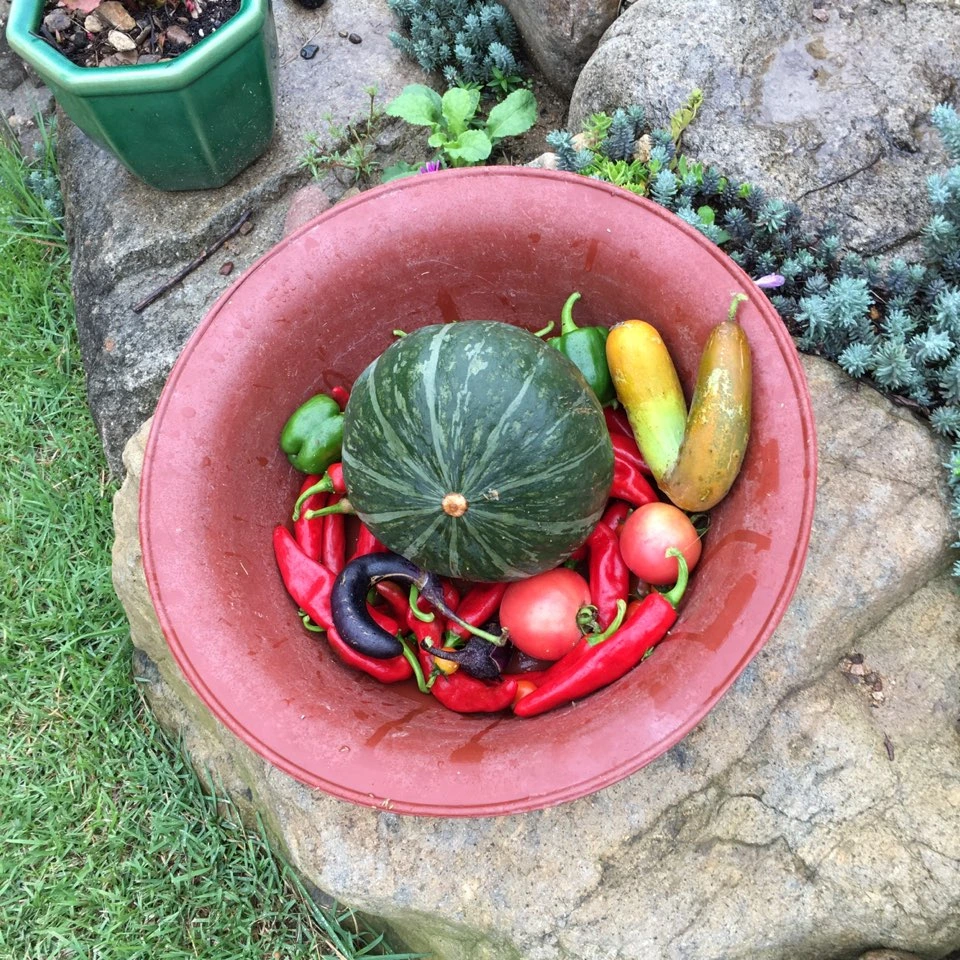 자란 노랑 호박과 샐러드 호박 피망과 홍고추