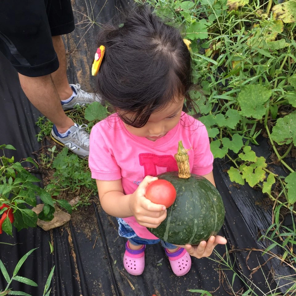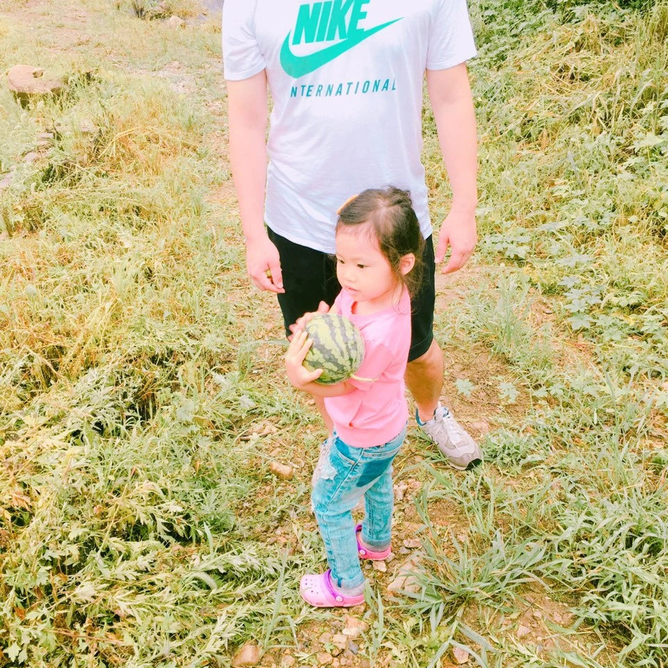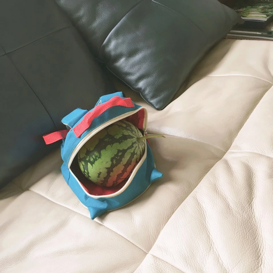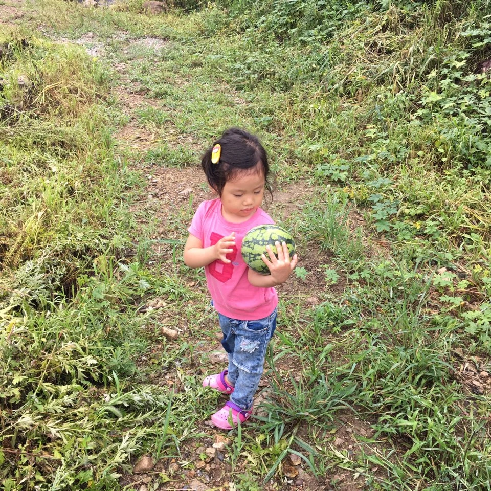 아이의 가방은 풀 숲에서 찾아낸 작은 수박