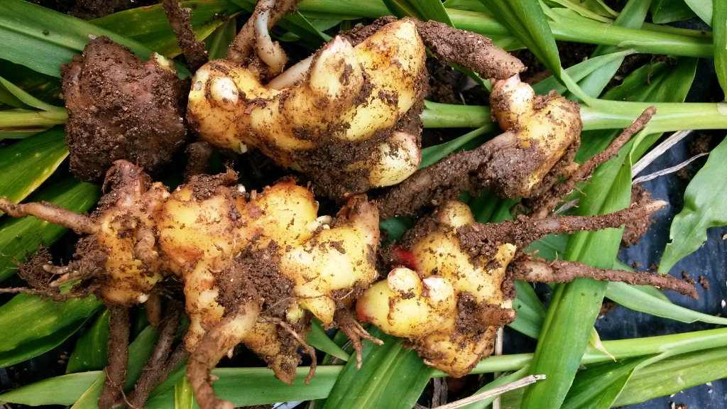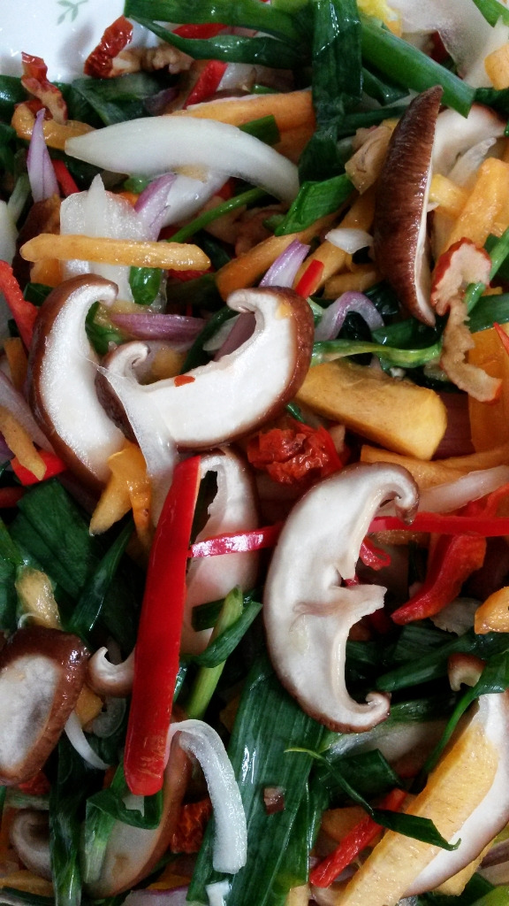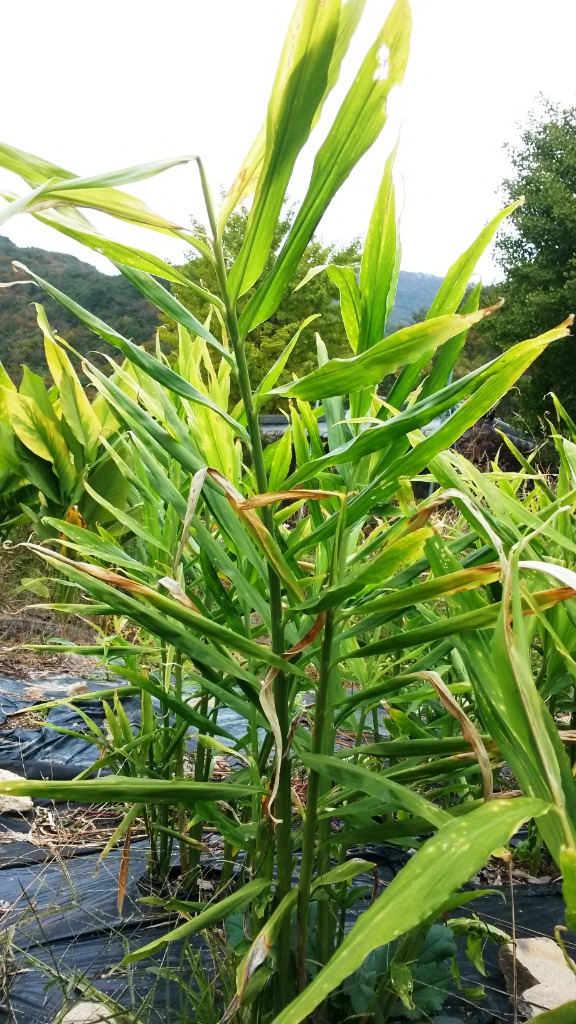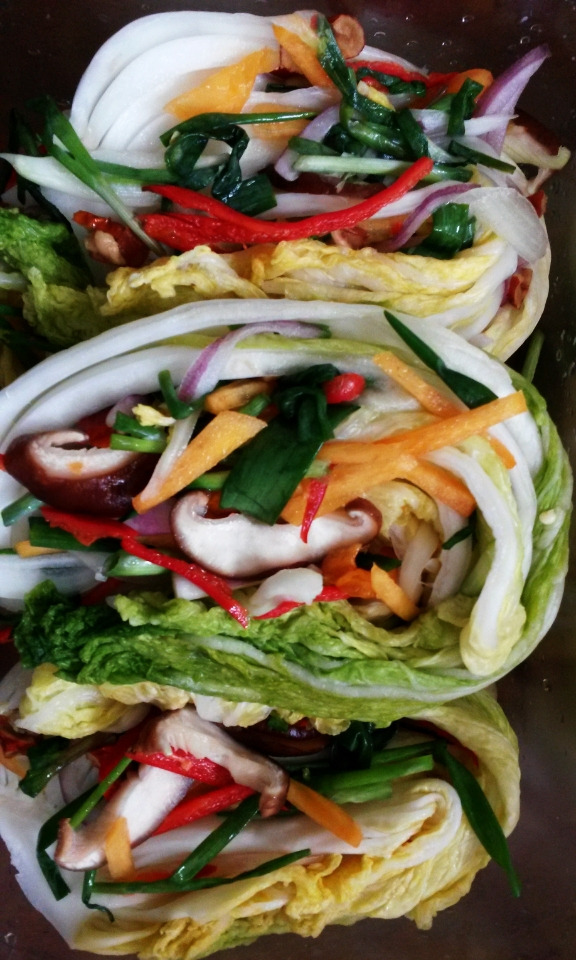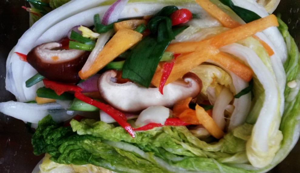 겉잎은 데쳐 고추장과 된장으로 나물무침을했고, 몇 장은 남겨 배추 전용으로 준비했다. 백김치 레시피를 검색해 보니 집에 없는 게 대부분이다. 일단 신선한 생강을 텃밭에서 한 뿌리 뽑았다. 작은 대나무 같은 초록 줄기 아래에서 연노랑 생강이 딸려 나왔다-예쁘다.당근도 없다.- 단감으로 대신하기로 했고. 실파도 없다-서너 번 자른 후 다시 올라온 텃밭의 대파로 대신했다. 향기 좋은 표고버섯은 고급스럽게 듬뿍!!!