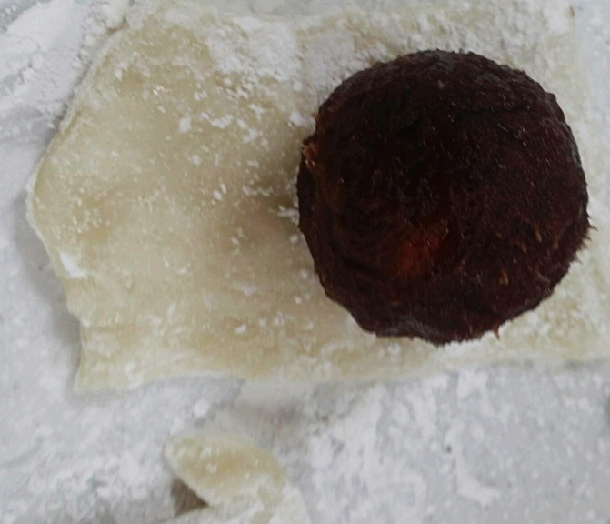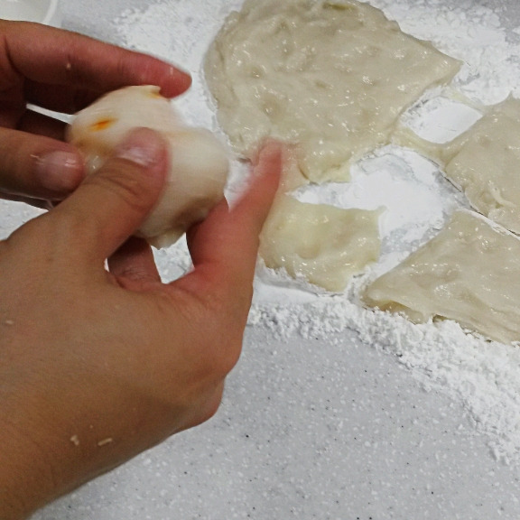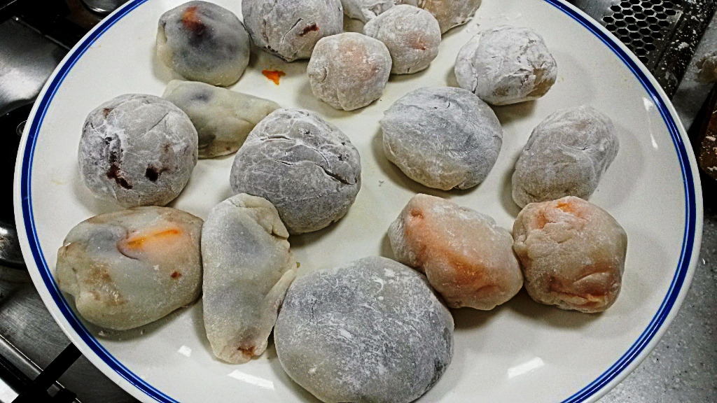 드디어 홍시로 속을 넣어 동글한 찹쌀떡을 만들기 시작했다. 내가 깎아놓은 감은 얼마나 큰지 반죽에 싸니 감이 툭툭 불거진다. 하지만 팥을 넣어봐도 마찬가지다. 이번엔 반죽을 크게 떼어내 아예 팥과 홍시를 같이 넣는 방법