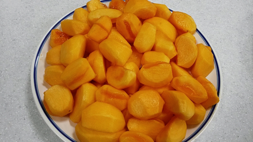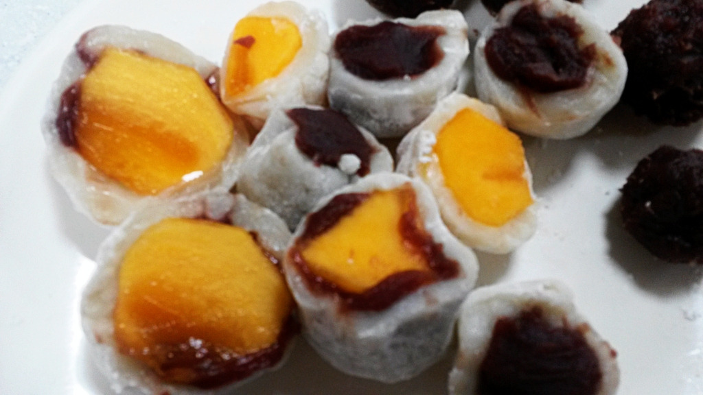 모든 것은 수작업으로 진행되었고 한정된 시간안에 완성해야 했다. 반죽은 끓는 물에 도넛 모양으로 만들어 투하하니 곧바로 떠올라 떡방아를 찧었다. 물론 내가 한 게 아니고 나는 둘러보다 찹쌀떡 안에 넣을 홍시 고명을 깎기로 했다. 탈삽(감의 떫은맛을 뺀)한 감은 먹어보니 톡 쏘는 탄산수 맛이 났다.