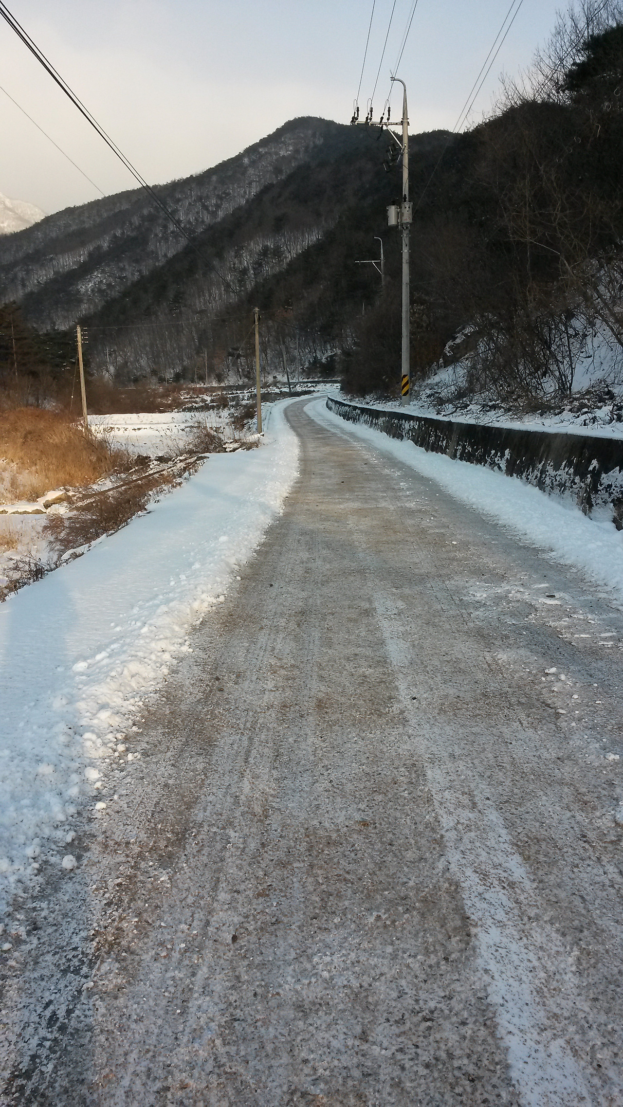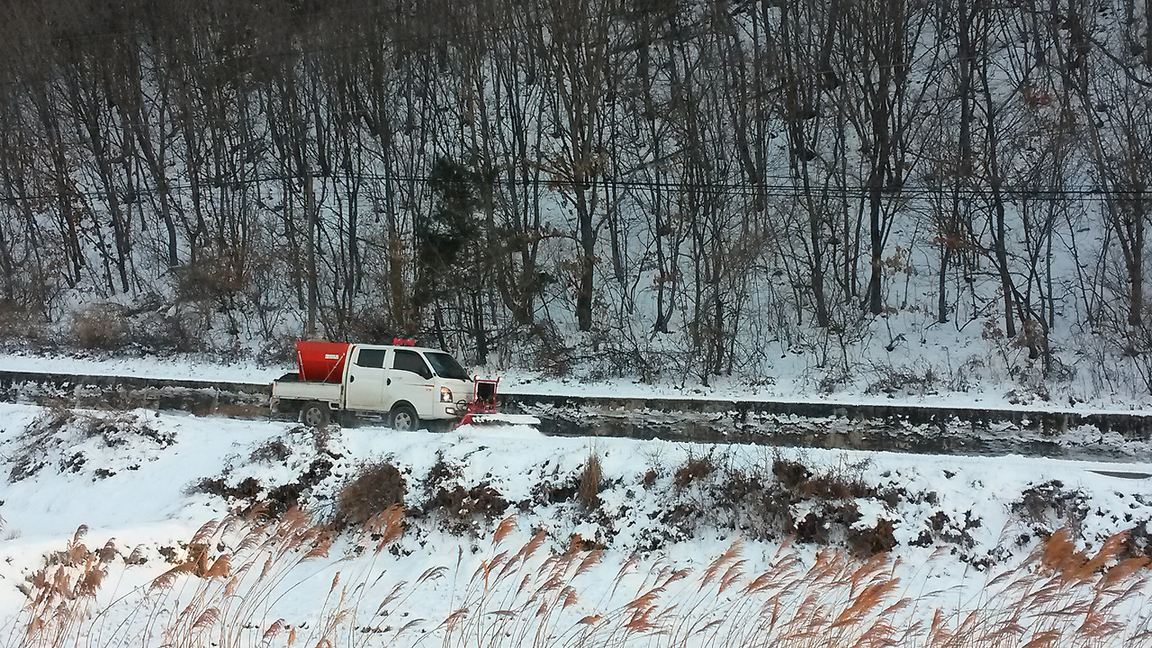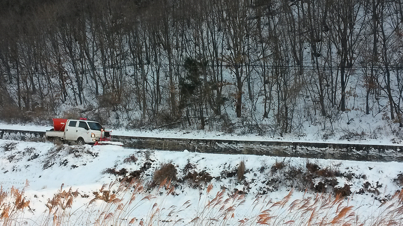 오늘은 차바퀴가 헛돌 것 같아 길을 나서기 어렵다. 면에서 나온 제설차는 앞으로는 눈을 길가로 밀어내고, 뒤로는 자동장치로 모래를 흩뿌리며 지나가고 있다. 완전한 봄이 되어야 사라질 눈! 눈 덮인 마을 풍경은 고요하다.