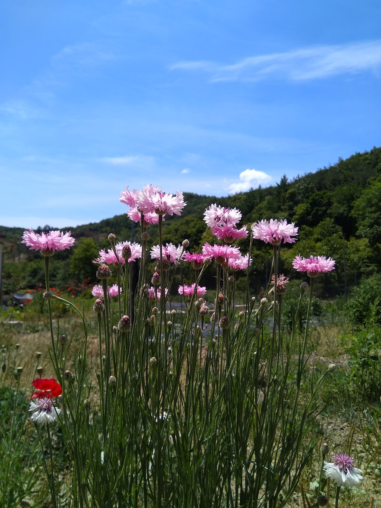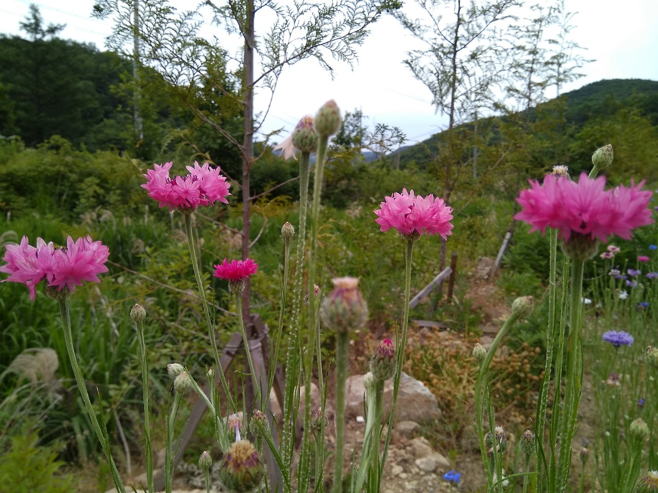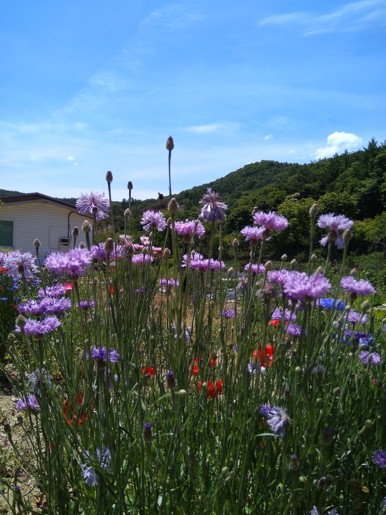 어느 날부터 감감했던 집 둘레 길에서 언제 키를 키우고 가지를 불렸는지 보라와 청, 자주와 분홍, 순백과 진분홍 색으로 수레국화가 피어났다. 눈으로 보이던 것만으로 판단을 내렸다면어찌 되었을까? 그 땅을 정리하고 다른 걸 심거나, 물 공급이 기능한 쪽으로 옮겨 심었다면 이 단단한아름다움을 볼 수 있었을까?