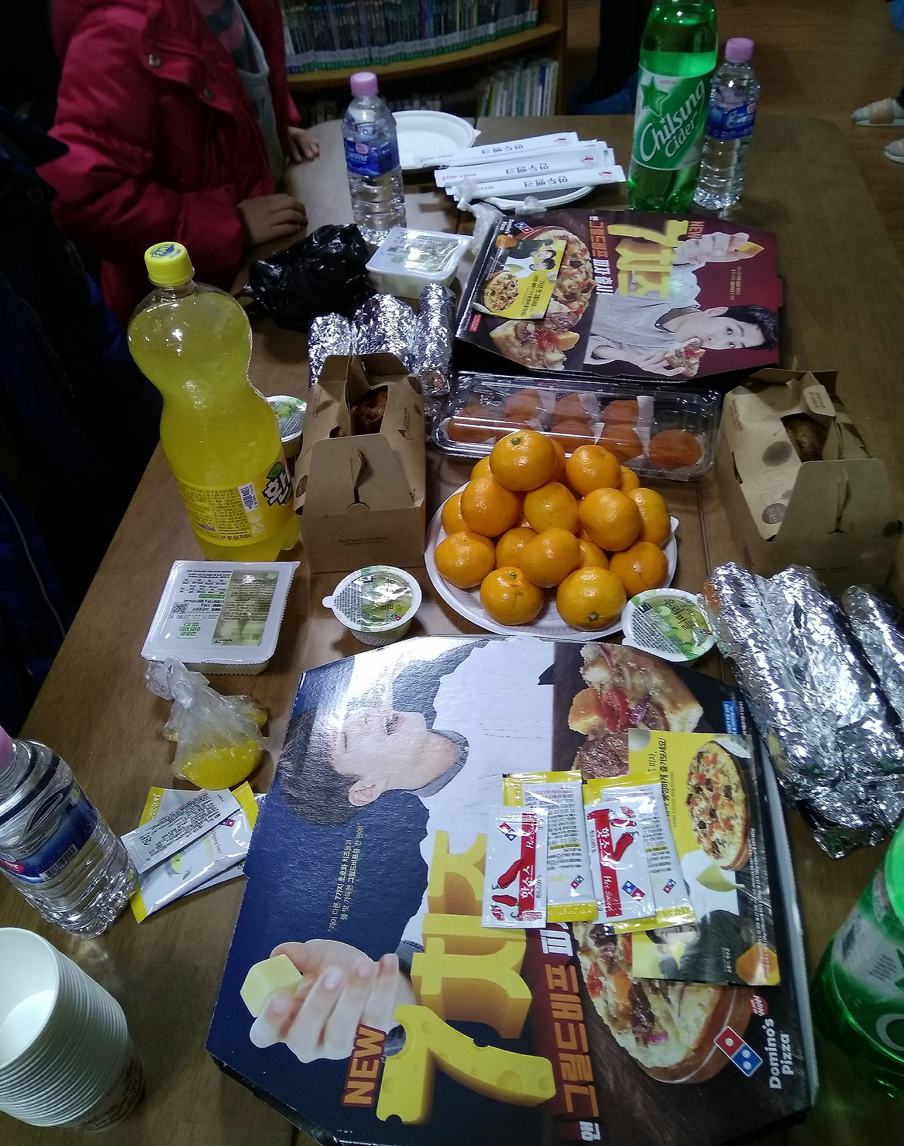 해물 피자와 김밥 치킨과 곶감 귤과 음료까지