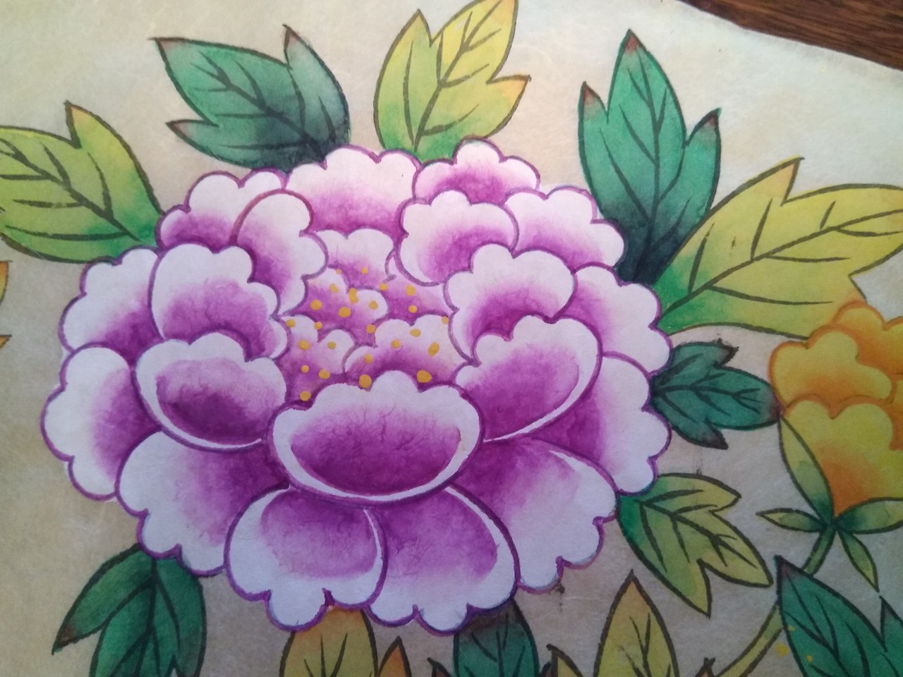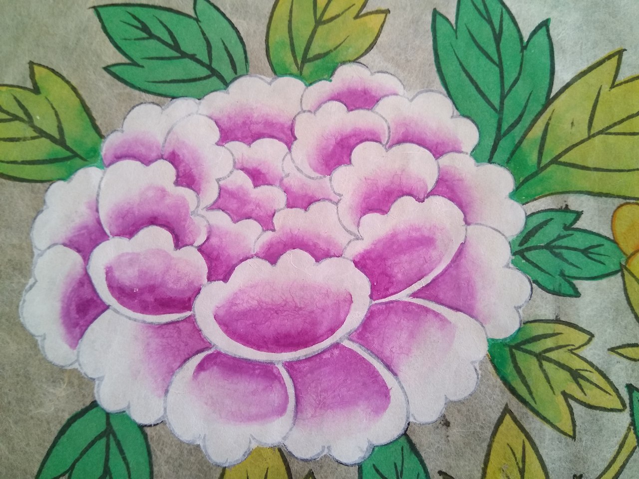 옻종이에 먹으로 본을 떠 물감에 아교와
