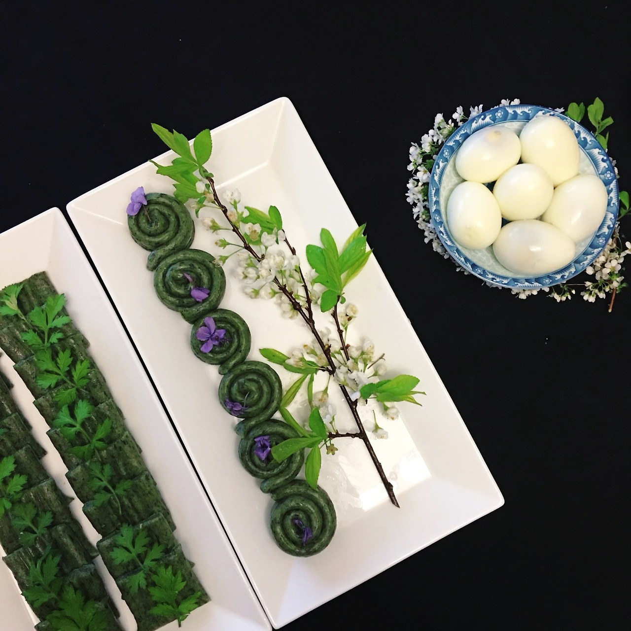 쑥버무리, 쑥 단자, 애탕국과 튀김, 나물, 쑥밥