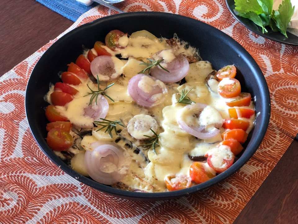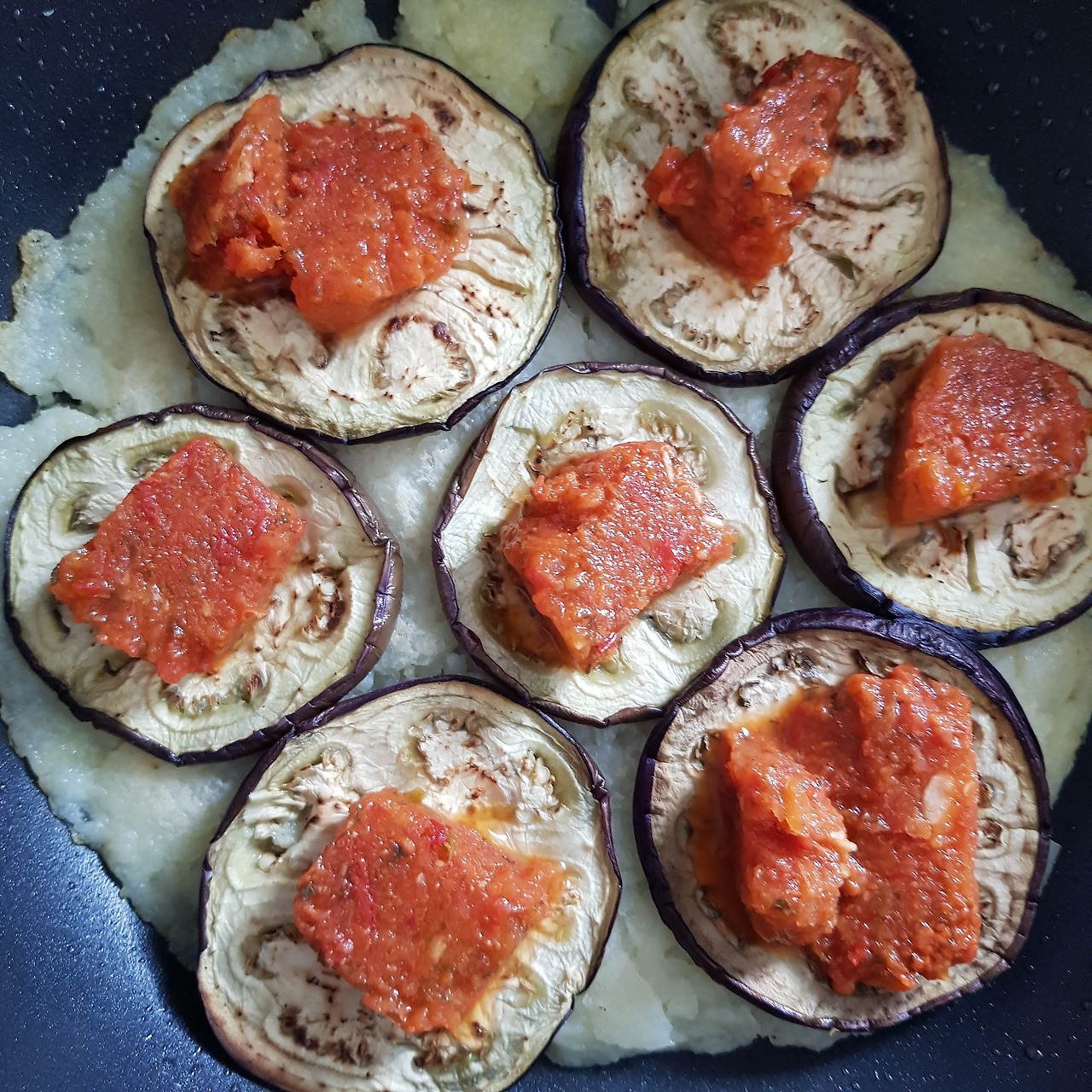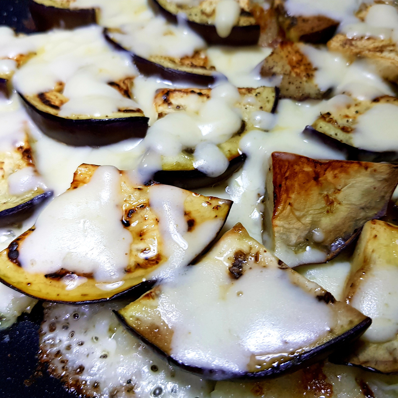 3. 한번 뒤집은 감자전에 구운 가지와 토마토(수확이 많을 때 졸여서 냉동고에 얼려두고 마늘 큐브처럼 쓴다.), 양파와 치즈 때론 오징어를 올려 뚜껑을 덮어두면 질리지 않는 맛난 감자 가지 치즈 구이가 된다.