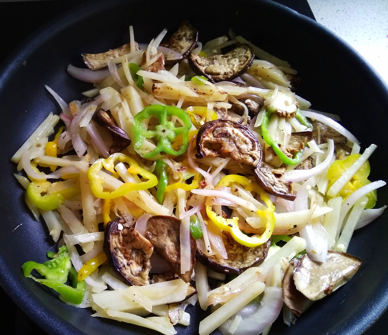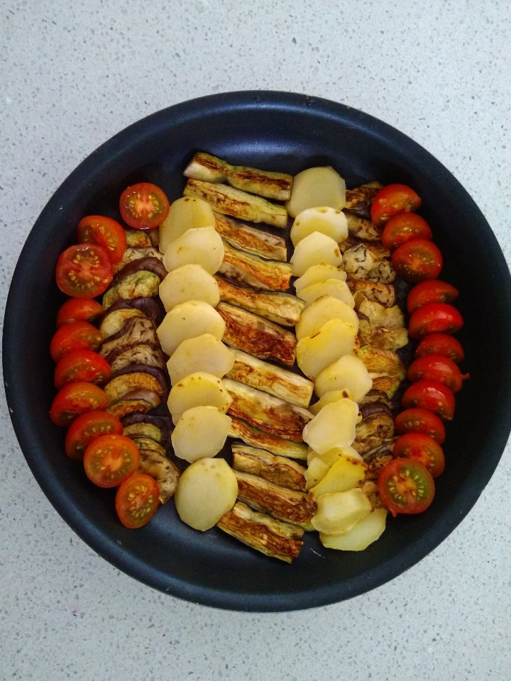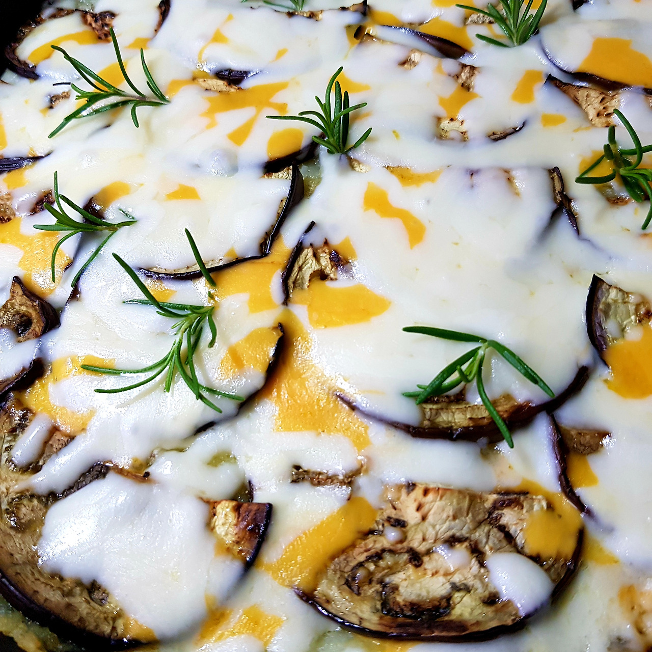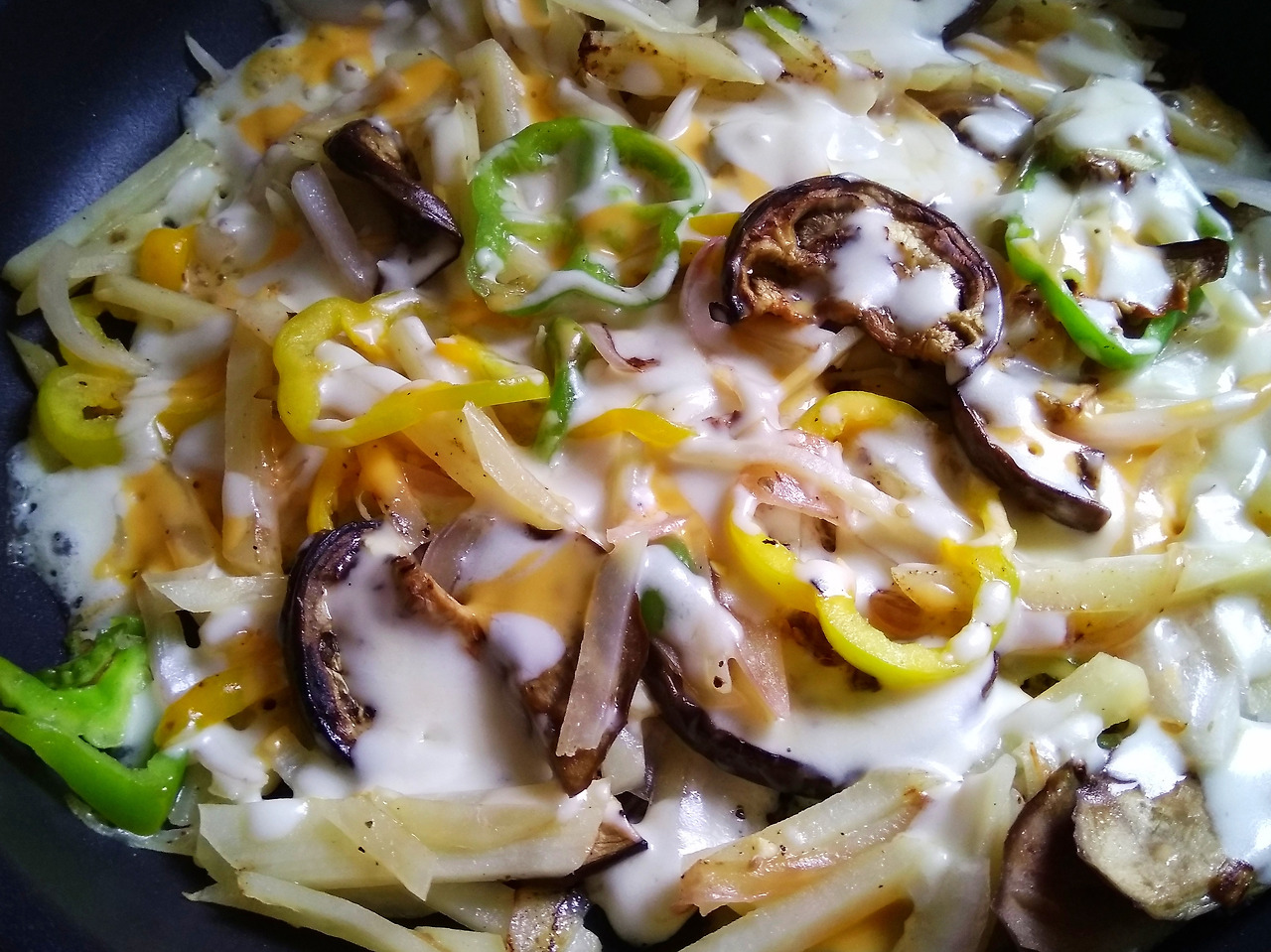 3. 한번 뒤집은 감자전에 구운 가지와 토마토(수확이 많을 때 졸여서 냉동고에 얼려두고 마늘 큐브처럼 쓴다.), 양파와 치즈 때론 오징어를 올려 뚜껑을 덮어두면 질리지 않는 맛난 감자 가지 치즈 구이가 된다.