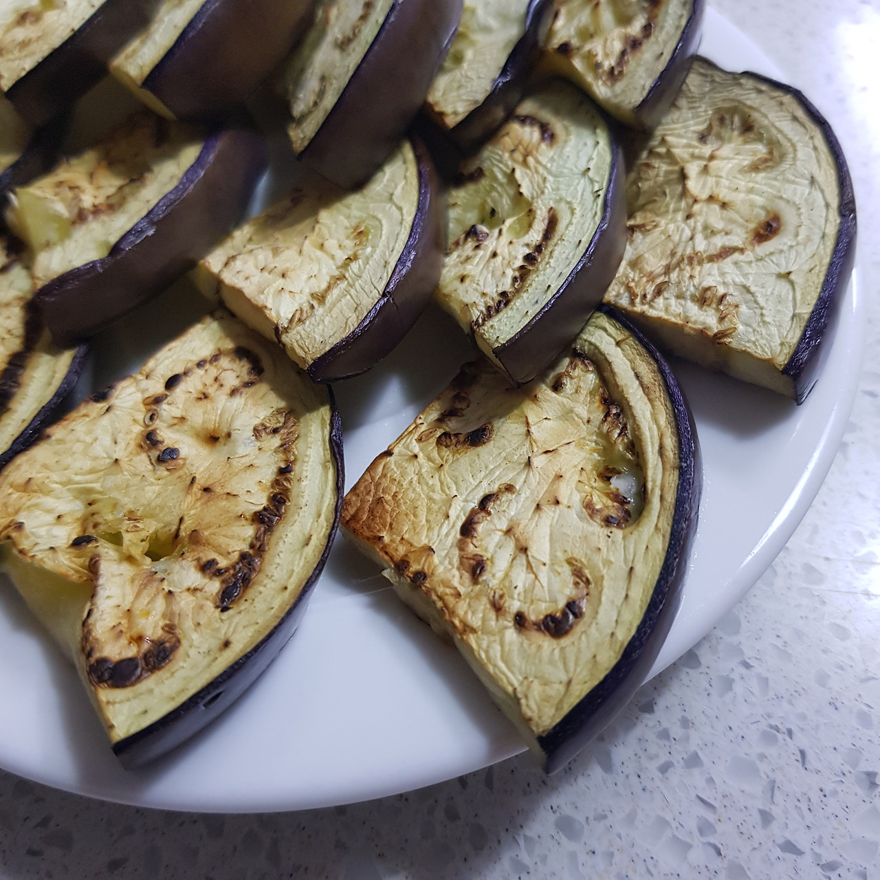 1. 가지는 기름 없는 프라이팬에시간이 날때마다 구워 놓는다. 이때는 구수하고 그윽한 향이 집 안 가득하다. 필요한 만큼 쓰고 냉장고에 넣어두면 다음번 요리 시간을 줄일 수 있다.