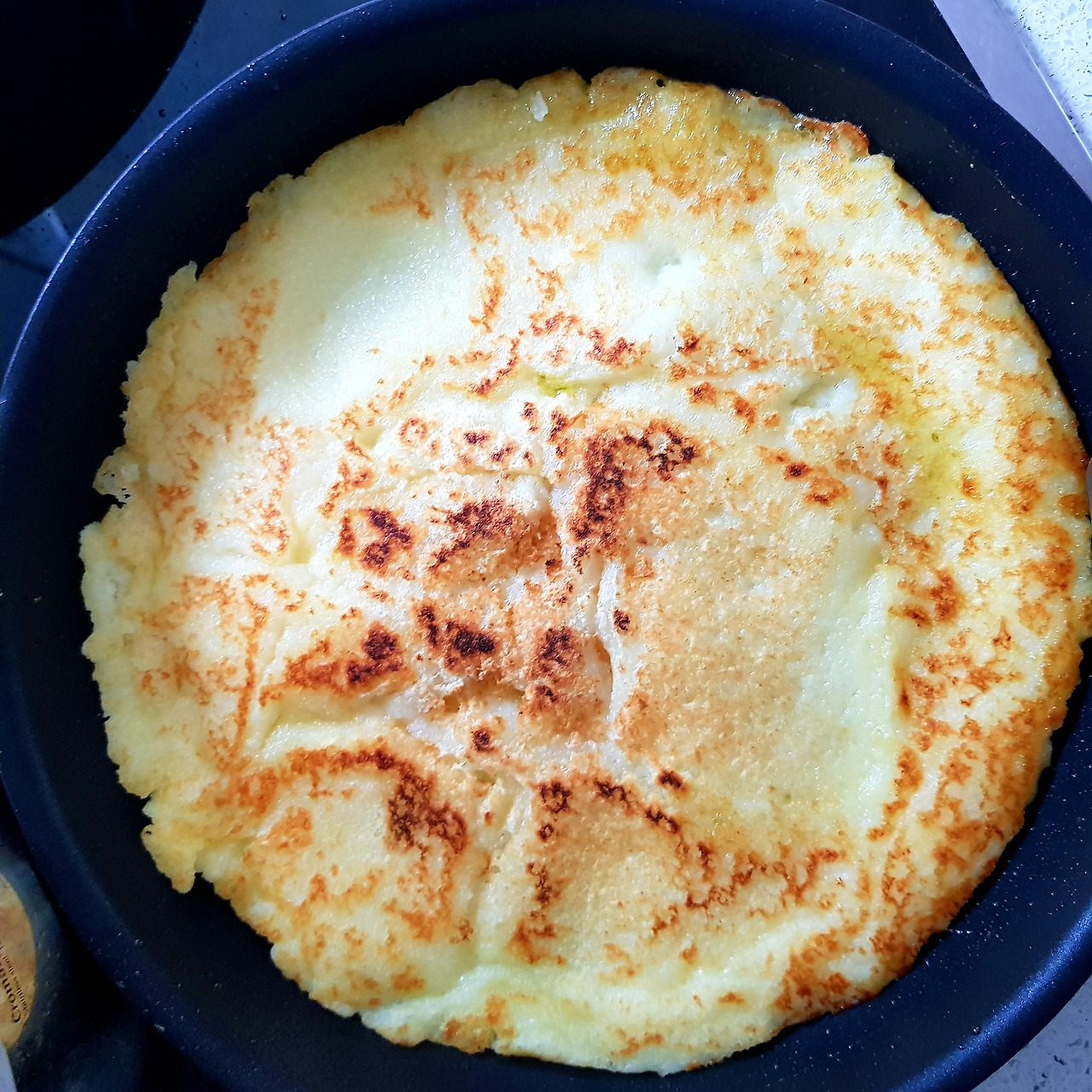 2. 껍질 벗긴 감자를 믹서기에 10초 정도 간다. 올리브오일로 뜨거워진 팬에 부어 굽는다.