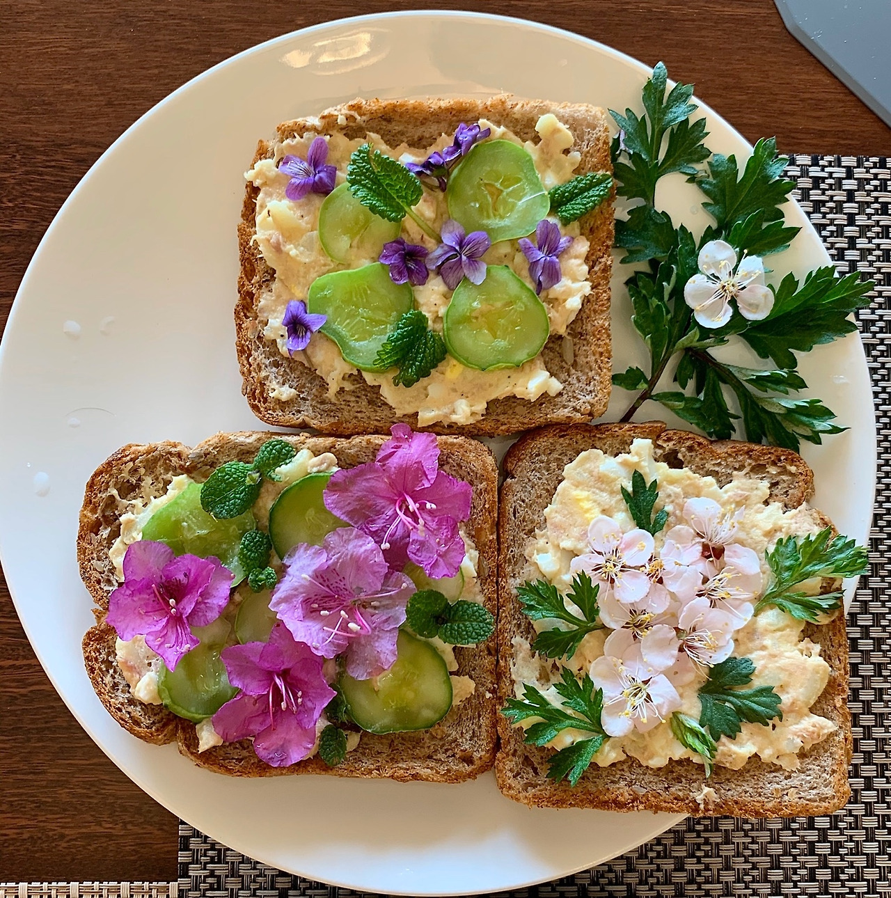 오늘은 나물거리 대신 식용 가능한 연분홍 진달래와 보라색 제비꽃, 매화꽃을 땄다. 작은 노랑 꽃다지와 냉이꽃 그보다 좀 더 큰 광대나물 몇 줄기도 더했다. 마지막으로 민들레 잎과 삼엽 국화, 쑥 그리고 겨울 지난 허브 잎을 모아 식초 물에 담가 두었다.