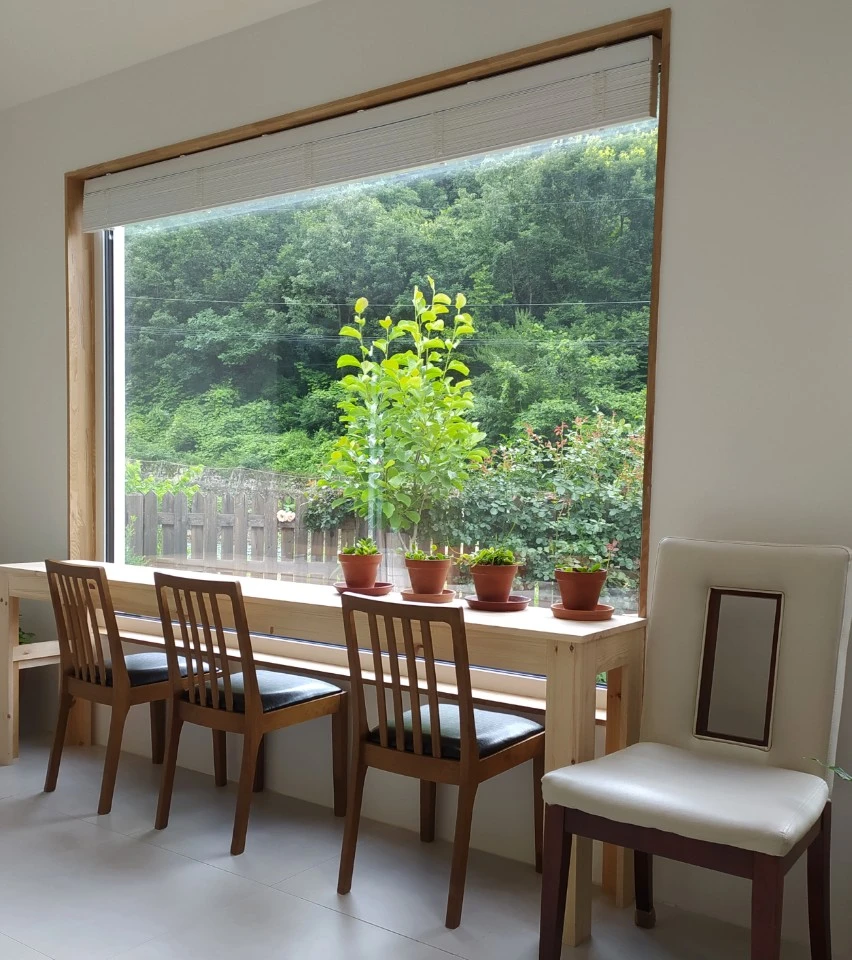 해만 뜨면 부엌과 다용도실을 지나 나무 계단을 내려선다. 곧이어 금색 꿀벌이 붙어있는 회색 문을 열고 나만의 서재로 들어선다. 통창 앞에는 하나에서 시작하여 지금은 넷이 된 초록과 나의 산촌 생활과 같은 시간을 보내며