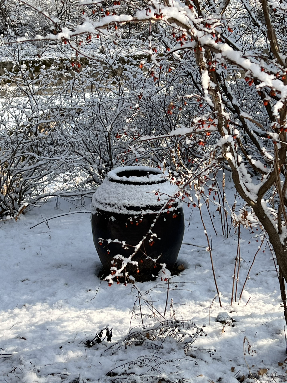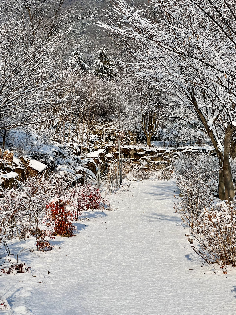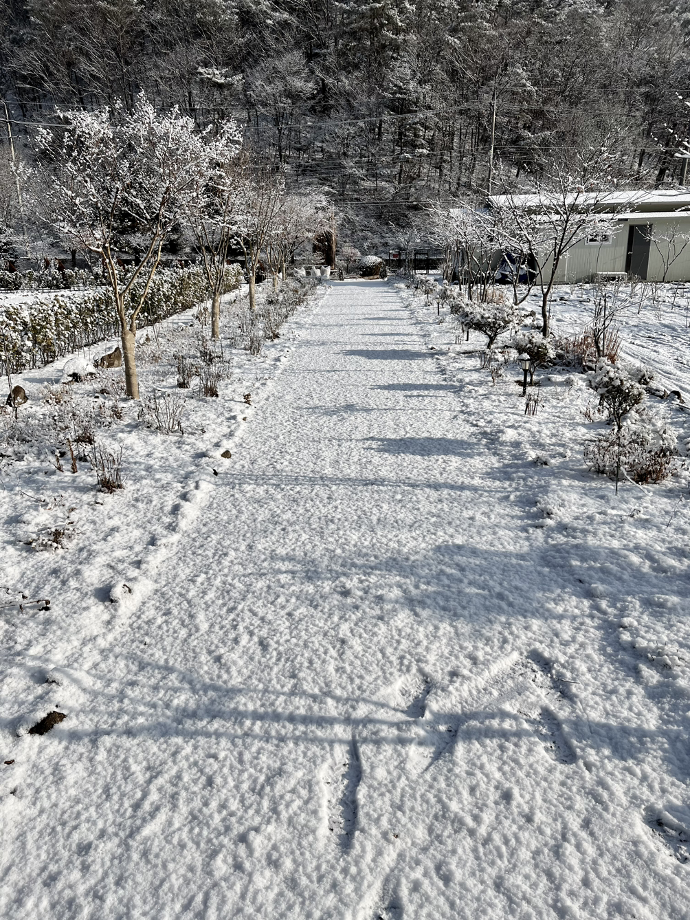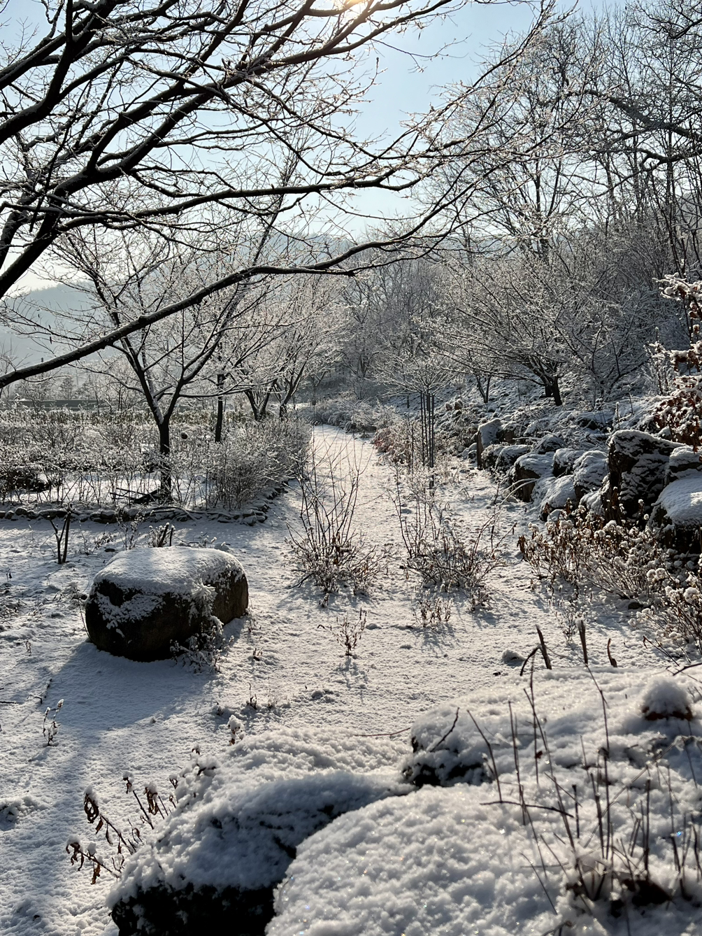 매너로서 ‘경청’을 좋아하지만, 전원생활을 시작한 이래, 남편과 나는 여러 조언들은 귓등으로 흘려듣고 우리 뜻대로 정원을 만들고, 산책로를 구상하고, 식생활에 필요한 만큼만 채마밭을 일궜다. 이곳엔 간 밤에 눈이 내렸다. 차고 메마른 겨울 정원에서 눈들은 아름다운 꽃으로 피어나고 있다.
