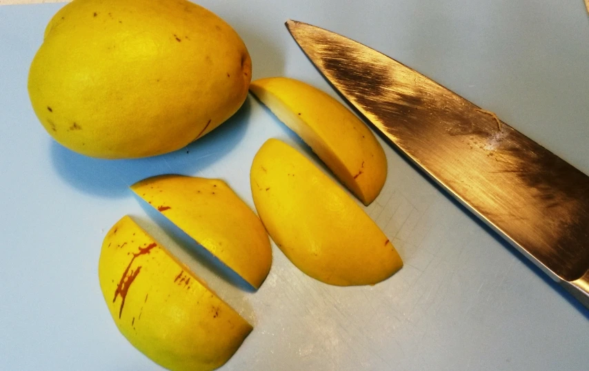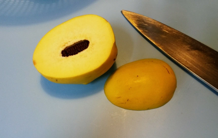 쓱쓱 잘라낸다. 호박 다음은 모과다. 날 선 칼날