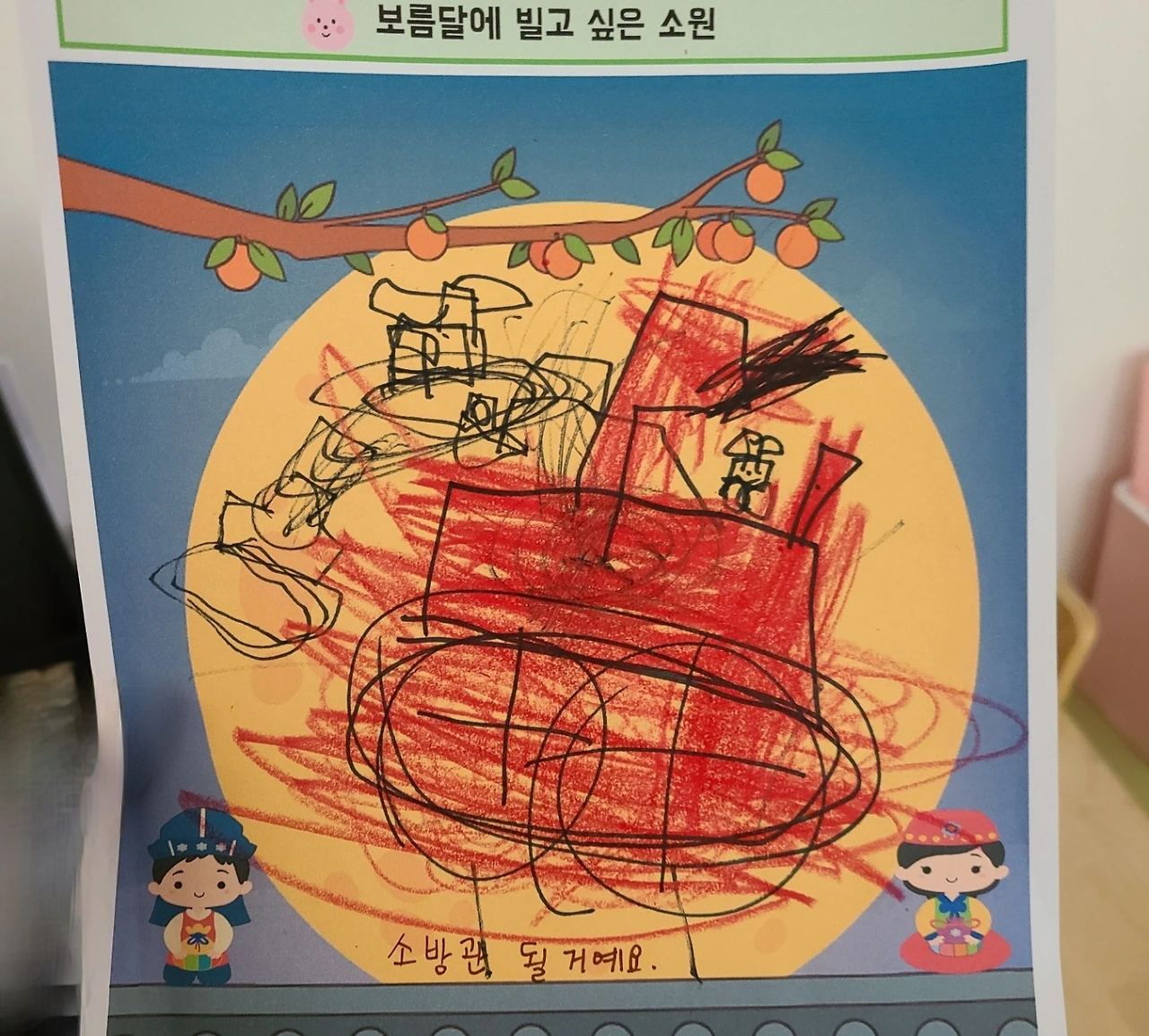 그 후 며칠, 추석이 기다리고 있었다. 유치원에서는 보름달에 빌고 싶은 소원을 주제로 그리기를 했다. 맑은 가을 하늘, 찬란한 빛을 유지하는 노란 보름달이 그려진 종이를 한 장씩 받은 친구들은, 서둘러 손을 움직이기 시작했다.