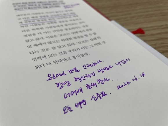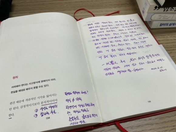 이 책을 읽는다기 보단 스스로 써 보는 시간이 훨씬 많다. 주석을 달 능력이 있다고는 생각하지 않는다. 감히. 그러나 내가 경험한 것들, 내가 중요하게 생각하는 것들, 이젠 성인이 된 아이들에게도 살면서 도움이 되었으면 하는 말들을 자꾸 써보게 된다.