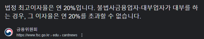 우리나라 법정최고 이자가 20%다. 이거 넘으면 불법이지요?