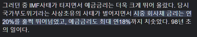 최근 모건이네 회사에서 금리 8%를 이야기하는 것이 농담은 아니라고 생각한다. 그게 주주서한에 쓰여 있다고 한 것 같은데, 쉽게 주주총회를 위해 주주에게 보내는 내용이다. 워런 버핏이 쓴 이 주주서한이 책으로 나올 정도다. 거짓말을 하면 심각한 타격을 받는다는 말이다. 내 기억에 국민학교 앞 농협에서 요즘은 이자를 주는지도 모르는 통장에서 저 정도 이자를 본 기억이 있다. 93년~97년 이자를 구글링해보이 엄청 높다.