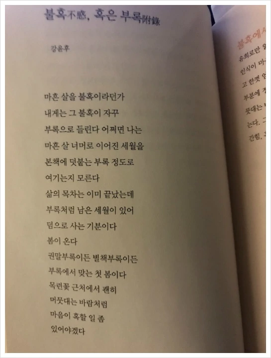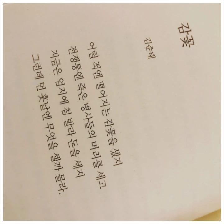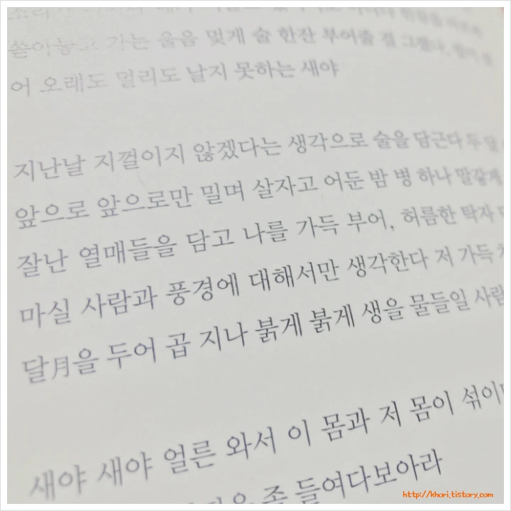 '내가 시집을 들고 읽게 될 줄이야!'라는 말을 할 만큼 시집은 나와 거리가 있다. 한편으로는 사람에게 다가오는 다양한 감정을 말과 글로 다 표현하기 힘든데 죽을힘을 다해서 펼쳐내는 것이 참 고생들 한다는 생각도 있었다. 그러나 점점 가끔 한 구절이 꼭 내 마음을 알아주는 것 같아서 말로 표현하지 못할 만큼 소중하게 다가오기도 한다. 그럼에도 조금 거리가 있는 것은 어찌할 수가 없다.