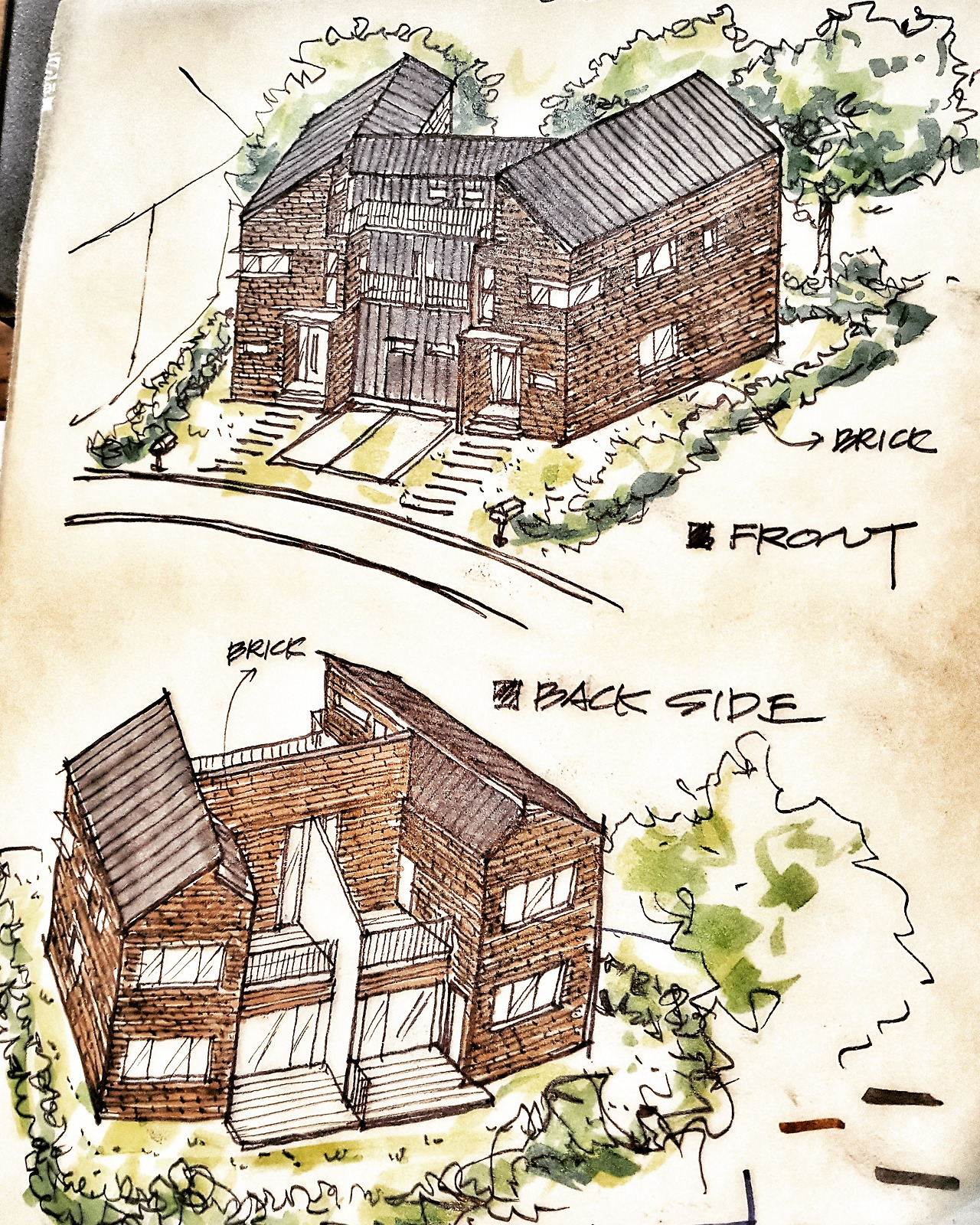 기본적인 외장재를 선정하고 보니 외부 벽은 벽돌, 지붕은 징크, 창호는 알루미늄 창호로 선정하게 되었다.