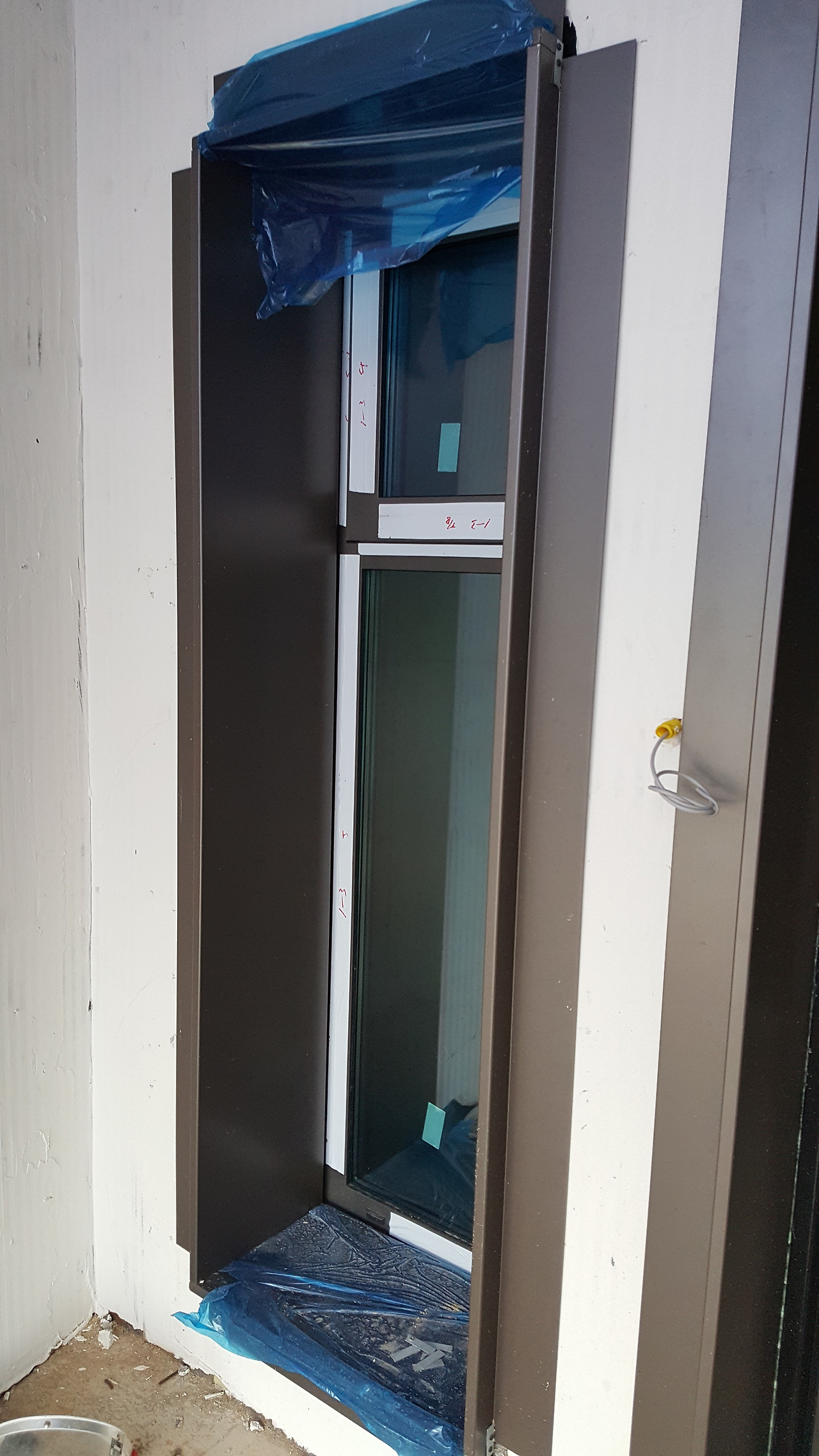 알루미늄 시트(2MM)를 디자인에 맞게 절곡 하여 소부 도장을 하여 창호와 통일감을 주기 위해 칼라를 맞췄다.