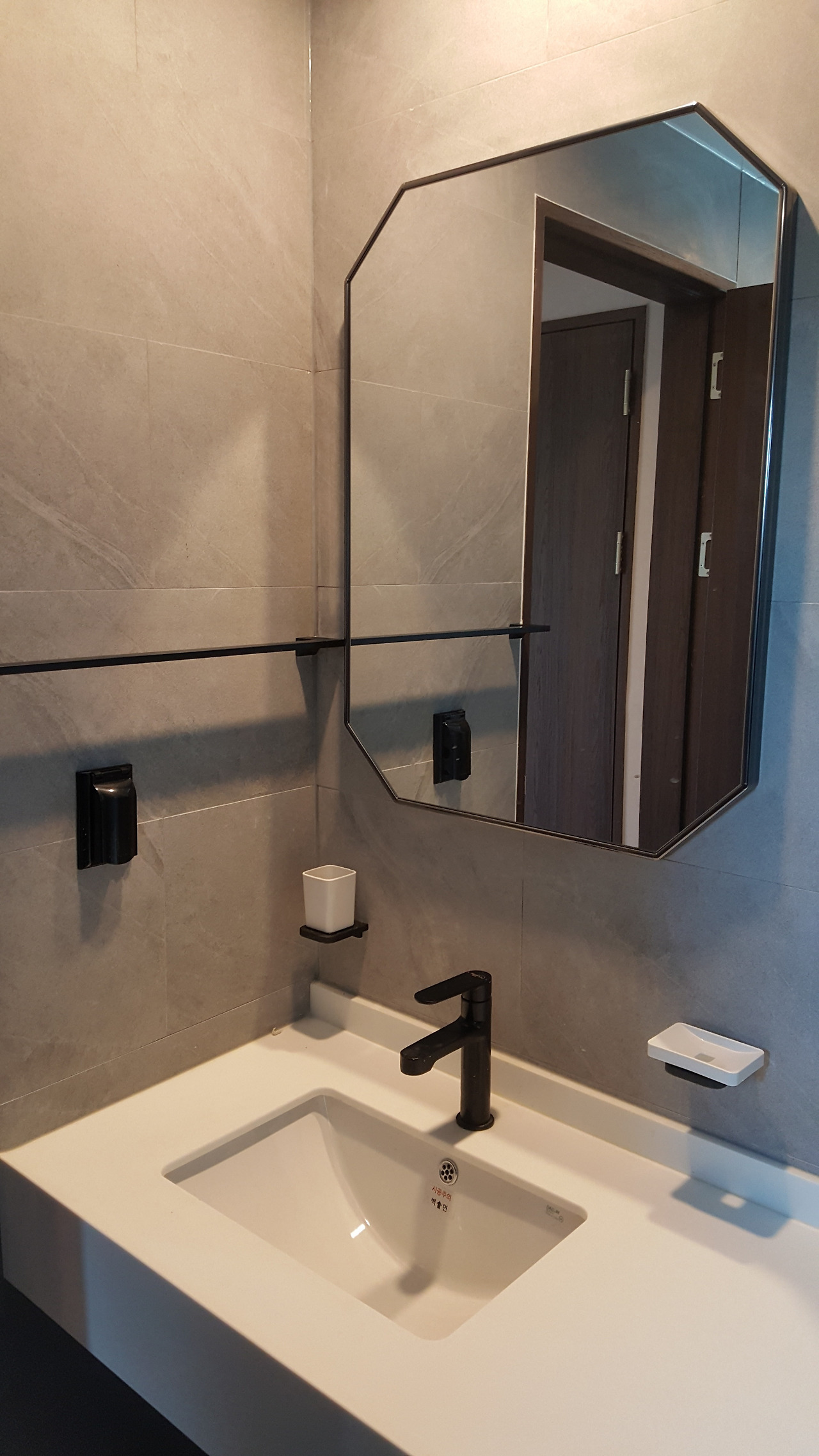 욕실장, 액세서리, 샤워부스가 블랙의 포인트 칼라로 통일되어 적용되었다.