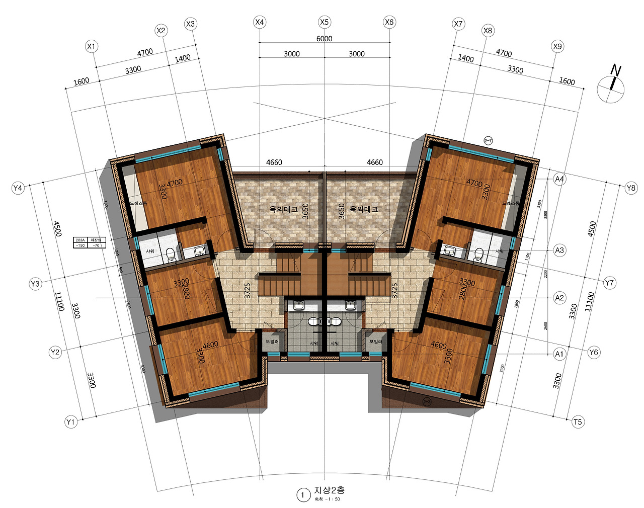 2층 공용욕실은 세면대와 샤워공간이 대면형으로 구성되었다.
