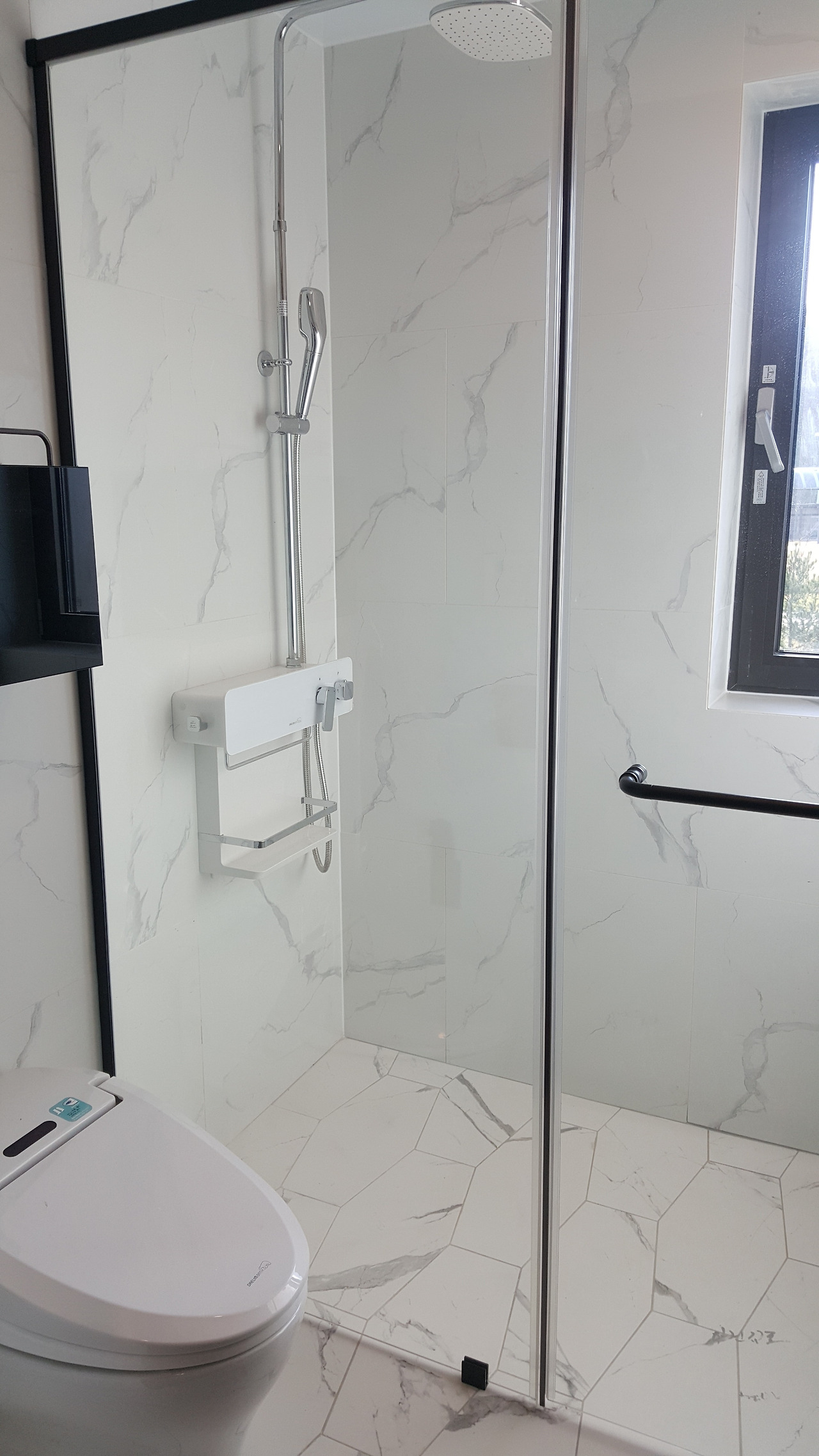 수전류, 액세서리, 콘센트, 샤워부스의 칼라는 블랙 무광으로 칼라를 맞춰 시공하였다.