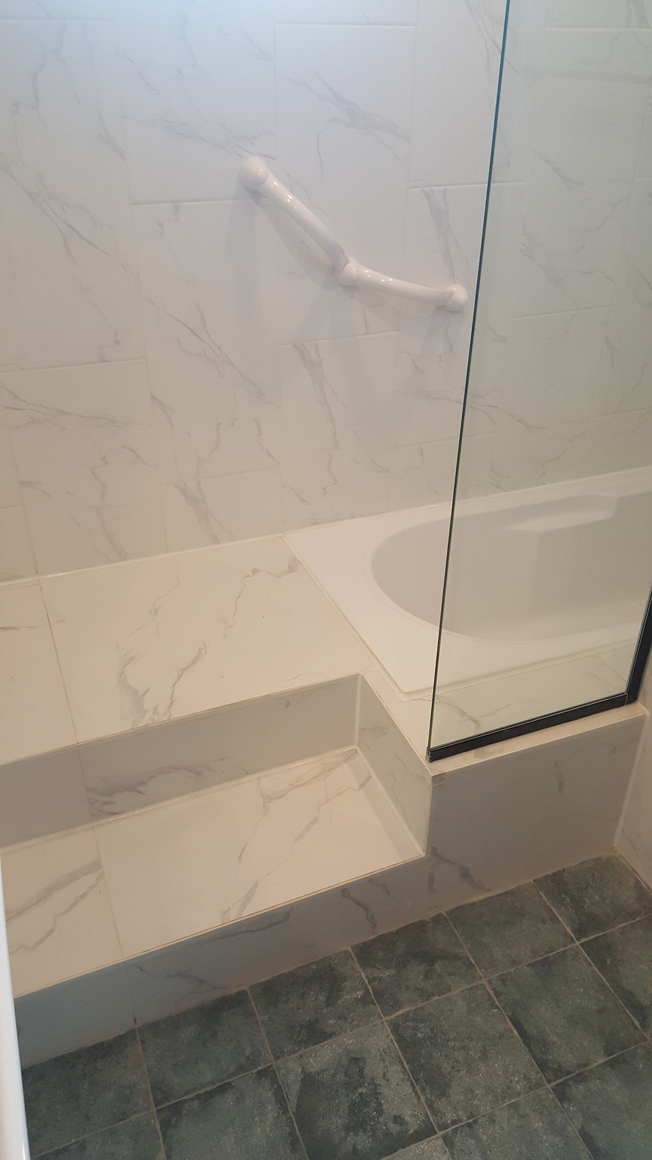 욕실 내부는 바닥(육각형태), 벽(600*600) 모두 WHITE 대리석 느낌의 석재 타일로 시공하였다.