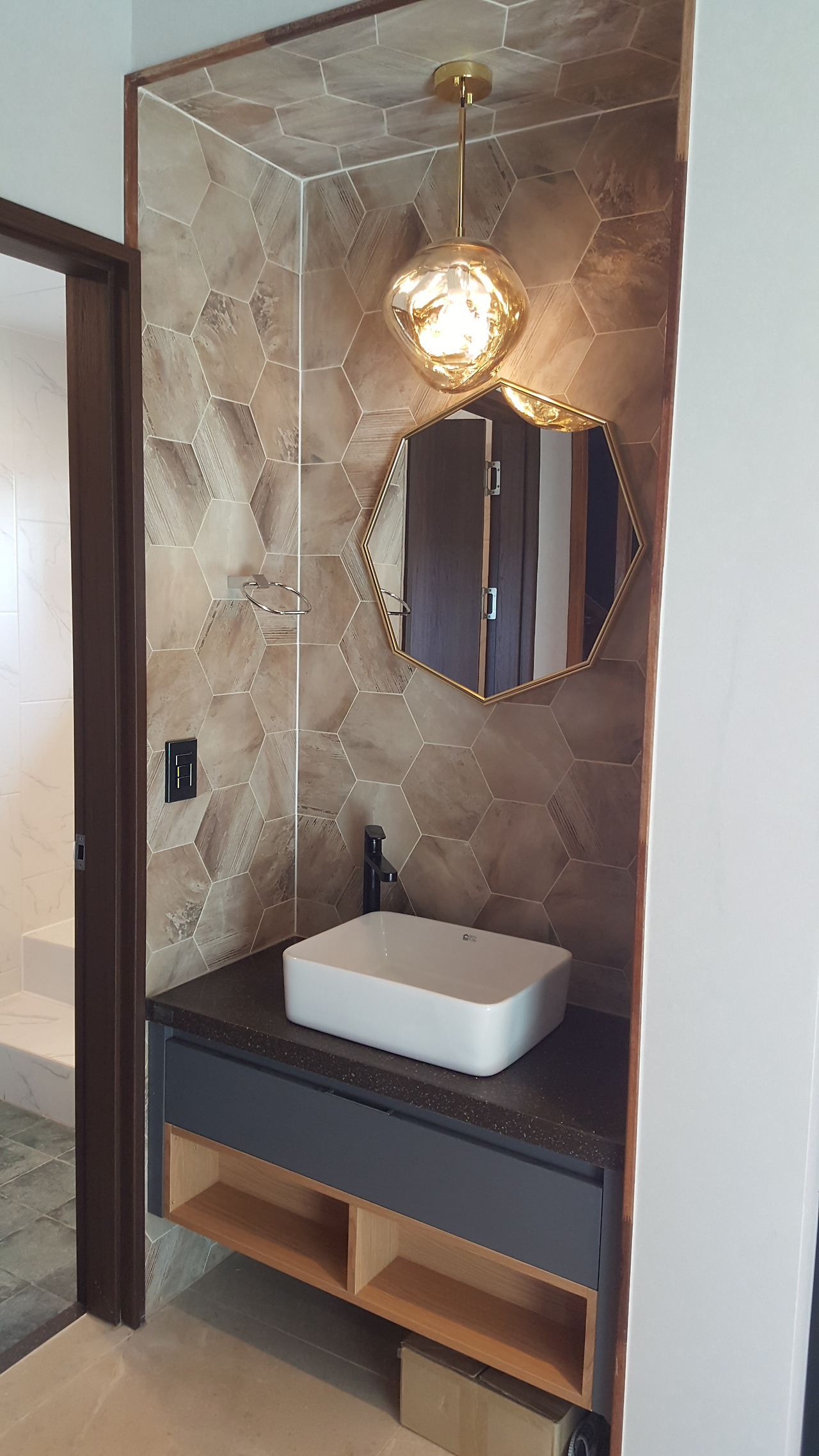 바닥에 육각 형태의 타일은 생각보다 시공이 어렵긴 했지만 마무리하고 보니 고급스러워 보인다.