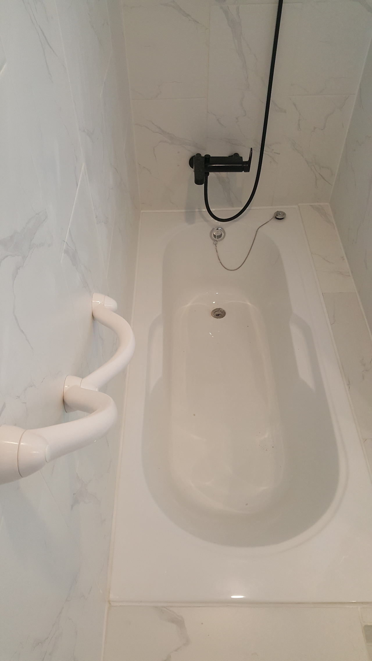 욕조는 어린이나 어르신들이 사용할 때 위험할 수 있기 때문에 계단을 만들어 연결시켰고 벽면에 안전 손잡이를 설치하여 이동시에도 사용이 용이하게 하였다.
