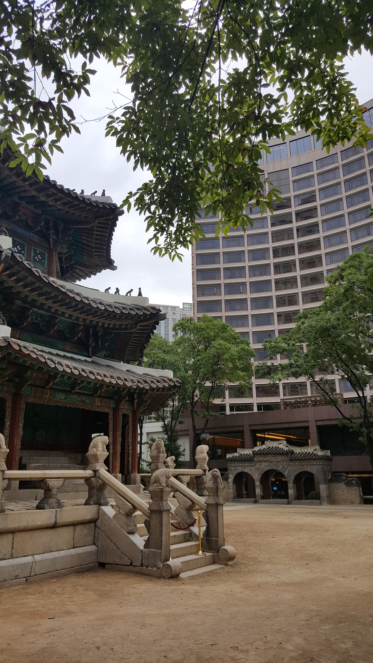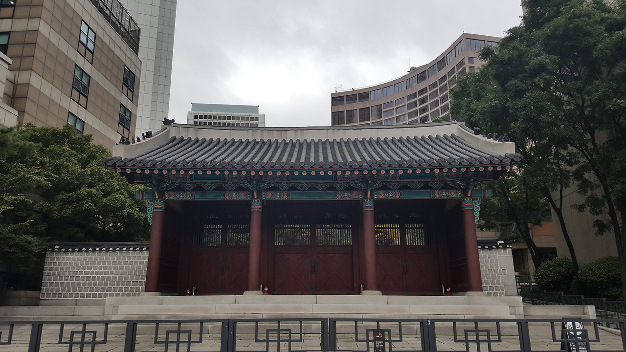 사울 시청 광장 주변의 높은 빌딩 사이로 환구단으로 오르는 3칸의 외문이 보인다.