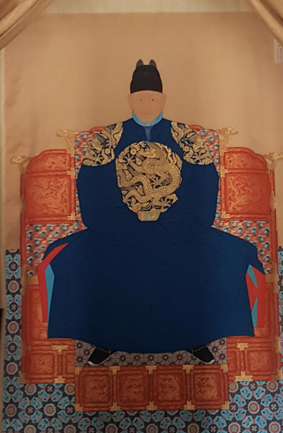 태조 어진은 청색의 곤룡포를 입고 입다.