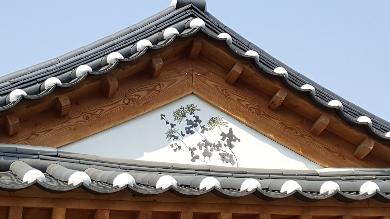합각에 새겨진 국화가 아름답다. 꽃을 그려 넣은 작가의 센스에 100점을 주고 싶다.