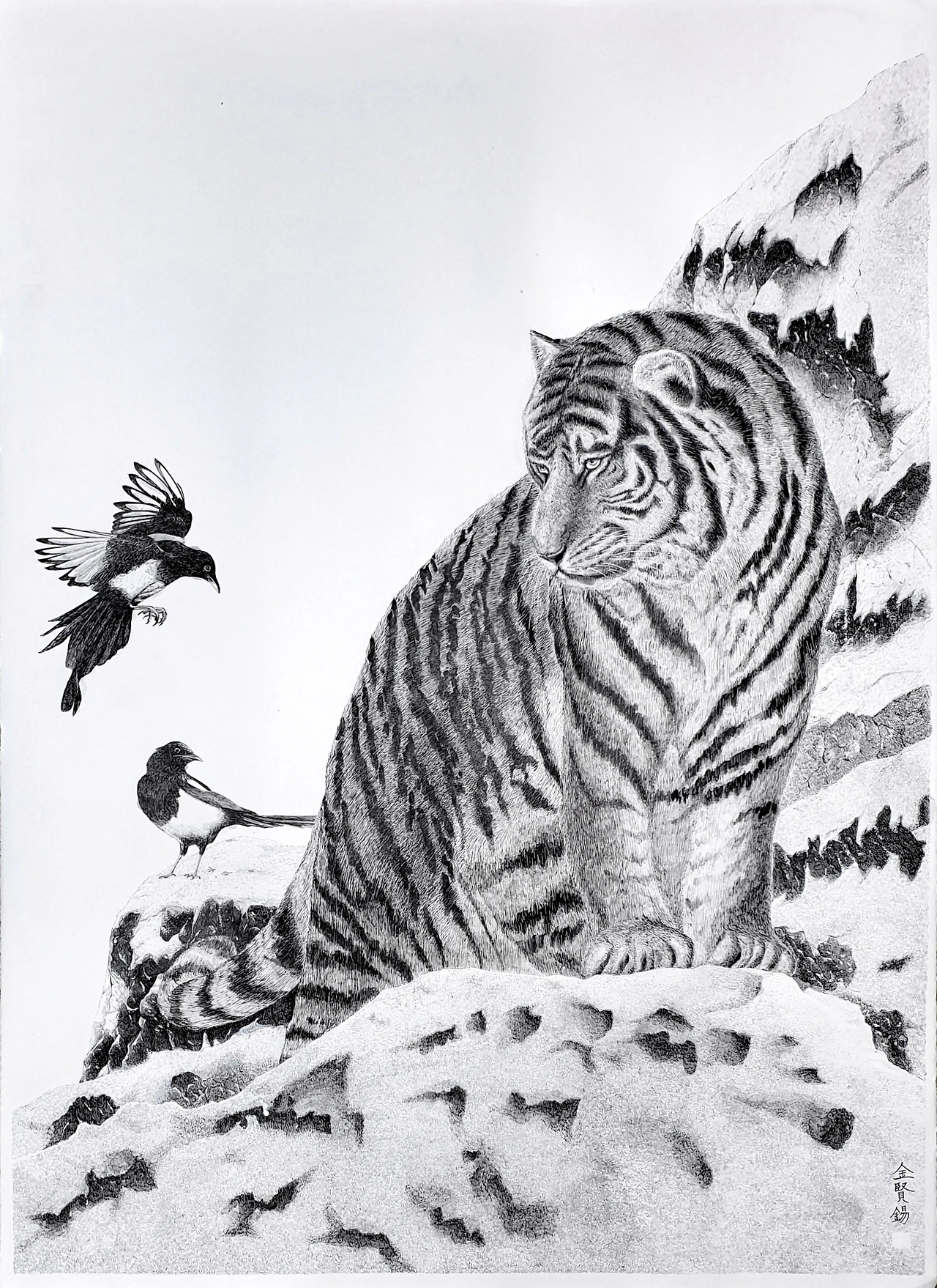 보통은 소나무가 배경으로 그려지는데 이 작품에는 설산을 배경으로 넣었습니다.