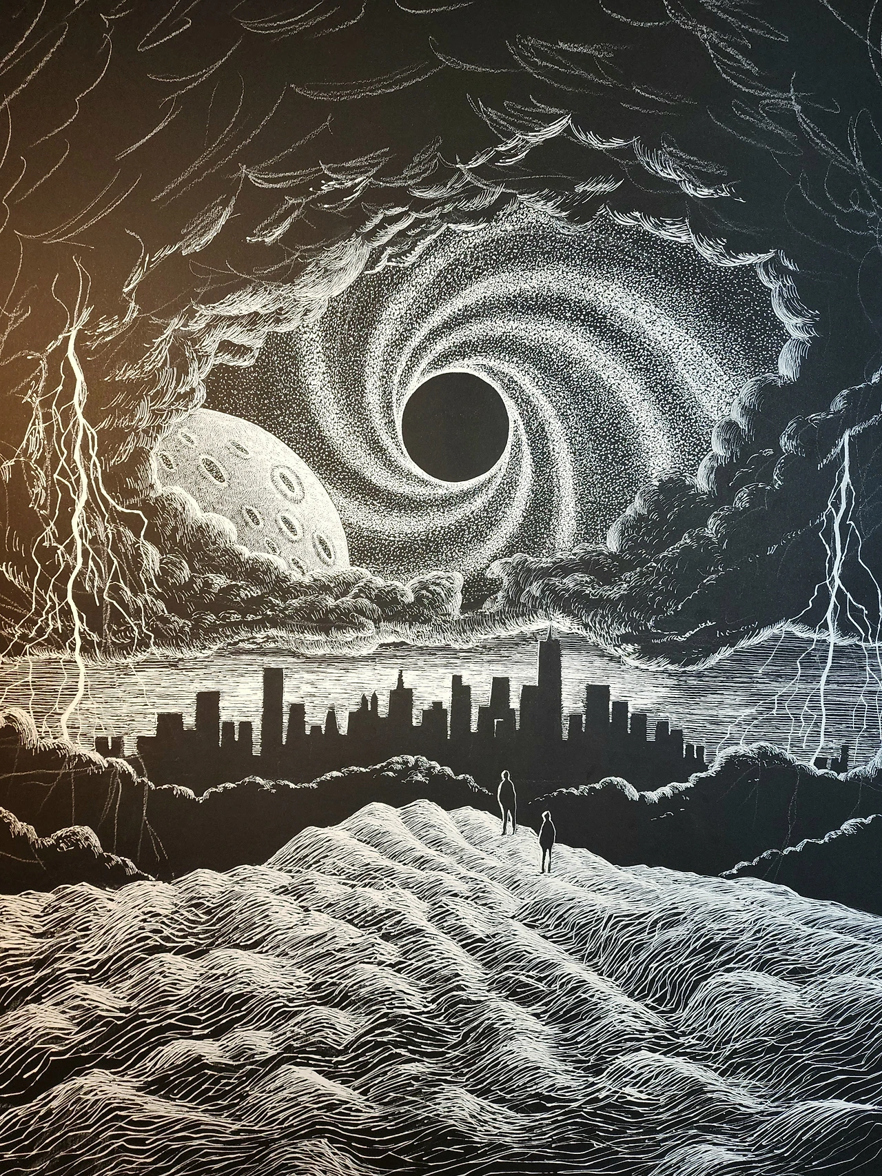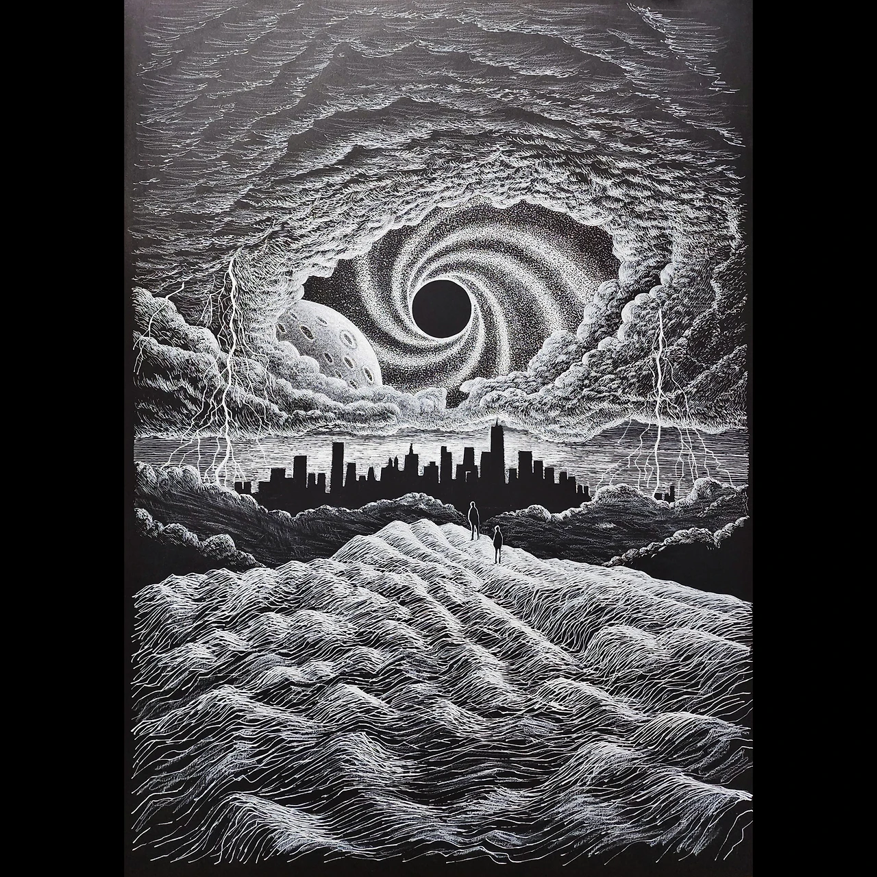 번개가 치는 구름들이 흩어지며 우주가 열리고 도시의 석양과 함께