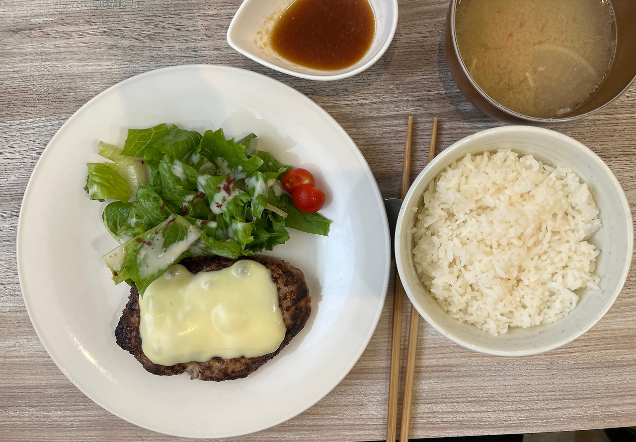 나는 기본 함박, 친구는 치즈 함박으로 시켜 먹었다. 치즈 함박은 치즈가 속으로 들어갈 줄 알았는데 위에 올라온 형태의 치즈 함박스테이크였다. 기억에 있던 것처럼 육즙이 가득한 고기의 맛을 느낄 수 있는 함박스테이크였다.