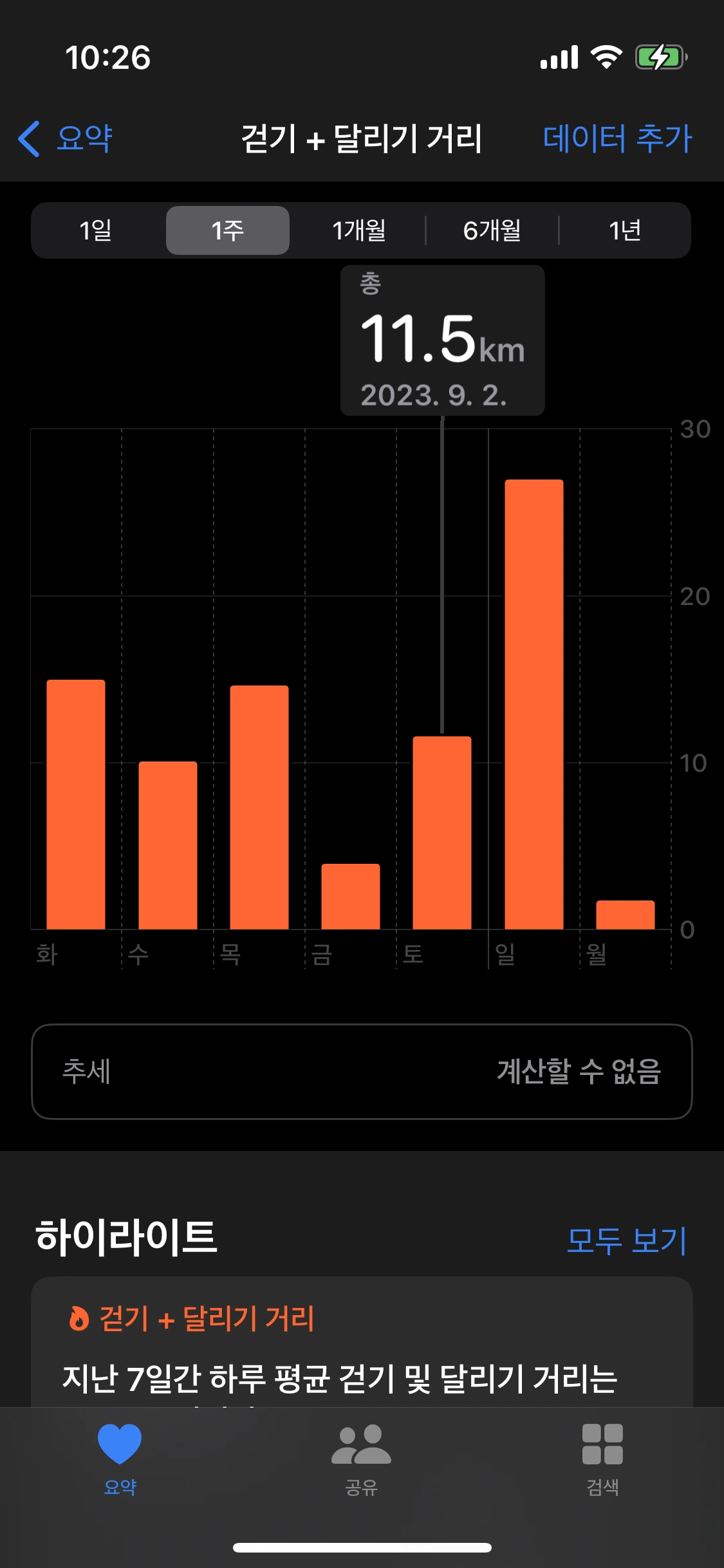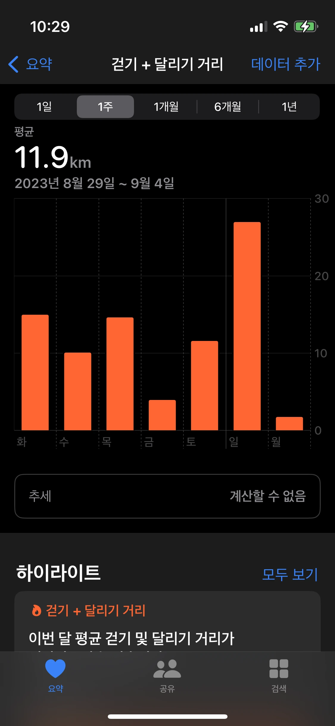지난주 평균 11.9킬로를 걸었다.