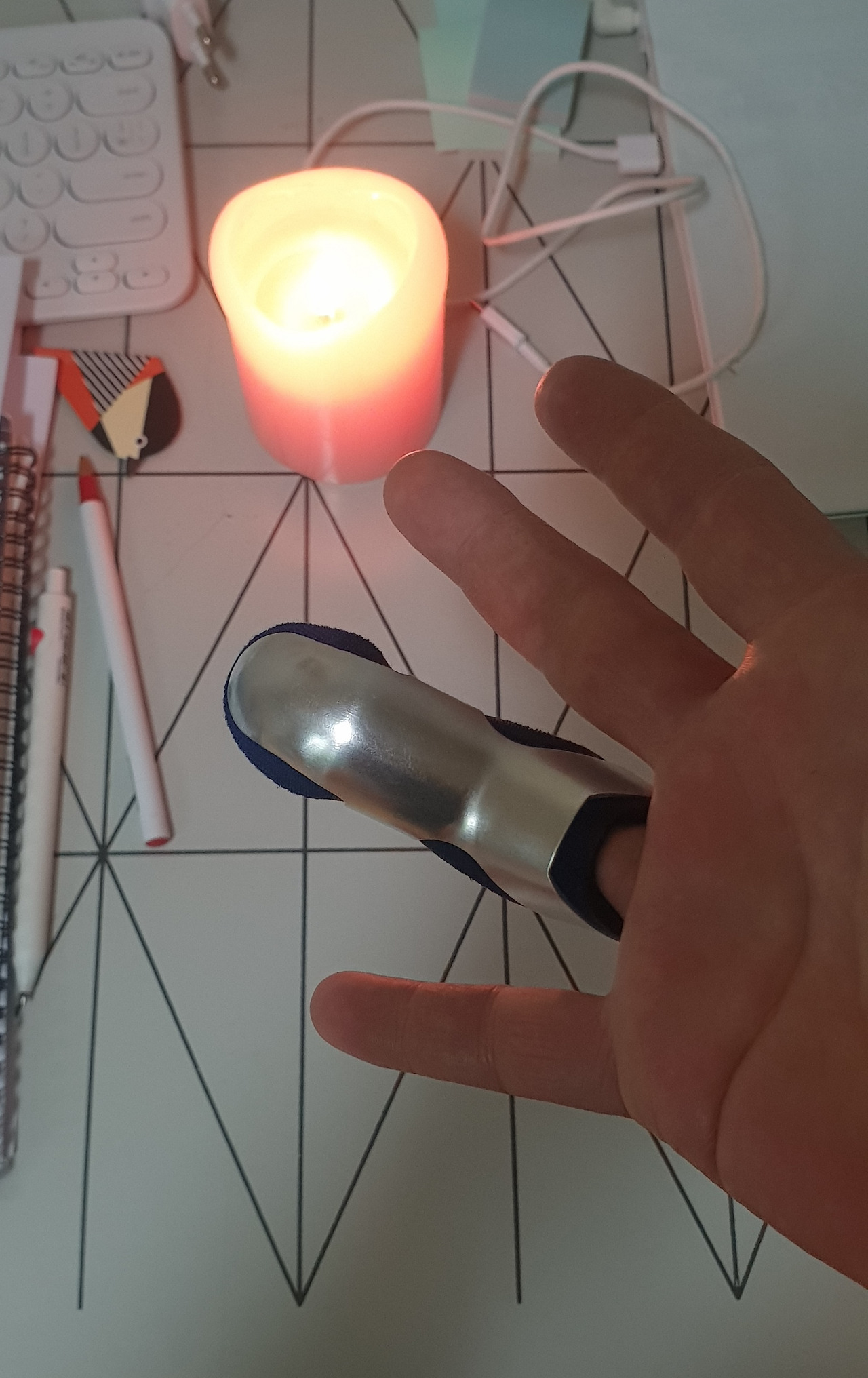 문에 찧여 팅팅부어 오른 손가락. 그걸 보호하는 보호대이다. 이 난리통에도 이건 어디로 날아가지 않고 손에 착 붙어 있으니 그나마 다행인 건가?