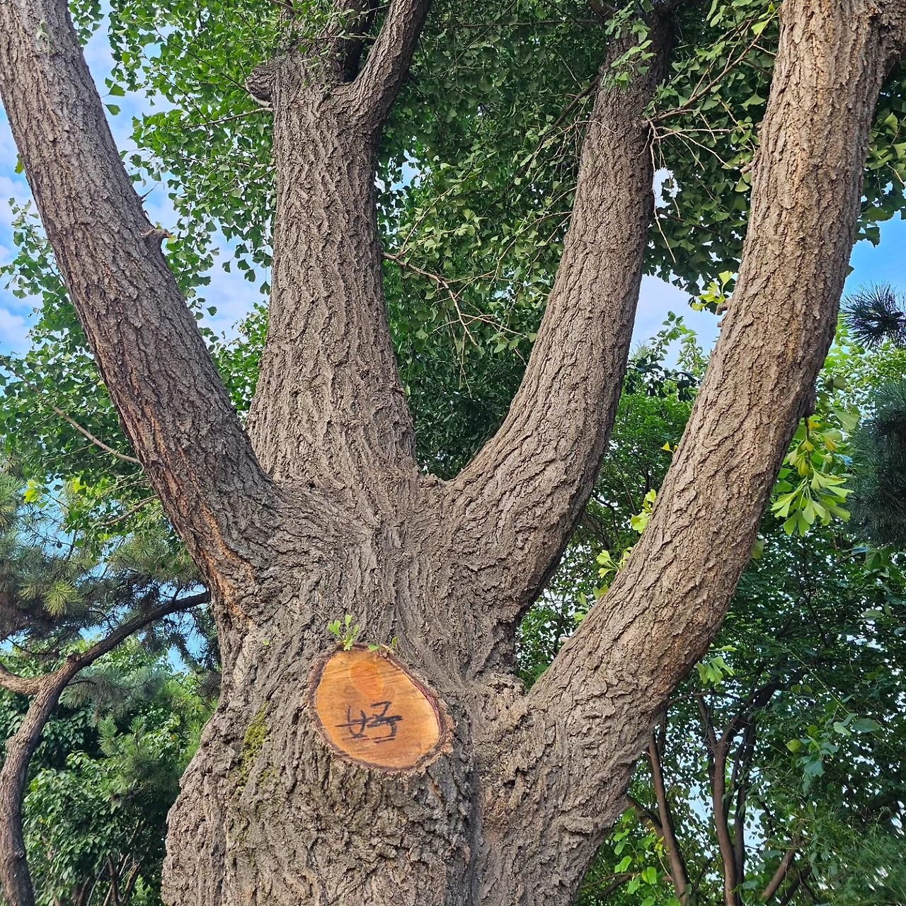 엄마가 아이를 꼭 안고 "우르르 까꿍" 하는 모습이니 좋을 호다. 마음 좋은 작업자는 아마도 잘린 단면에서 다시 새 생명이 태어나 자라주면 좋겠다는 마음을 표현했을 테니 좋을 호다.