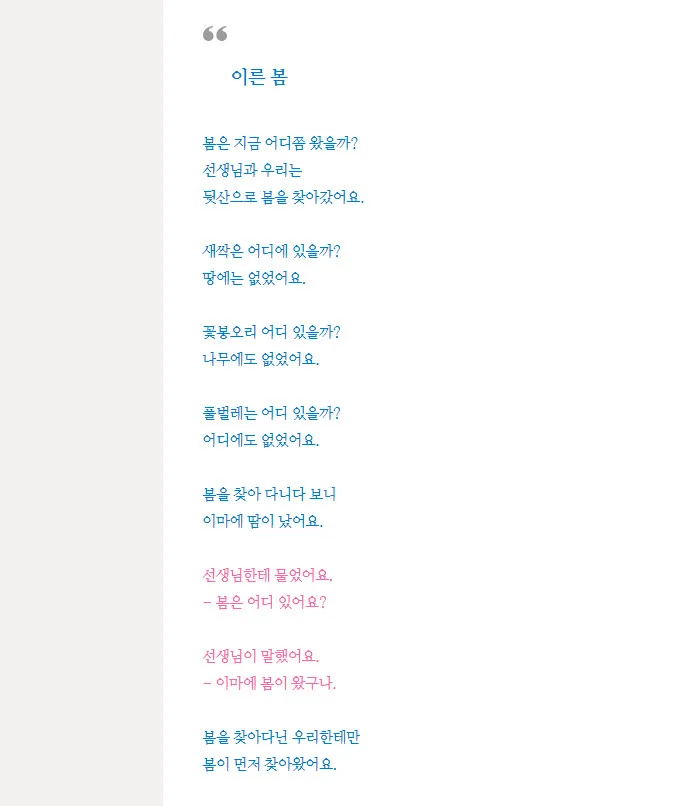 "아직이다. 소년아." 실망한 소년이 다시 묻는다. "그나저나, 봄은 어디서 오나요?"