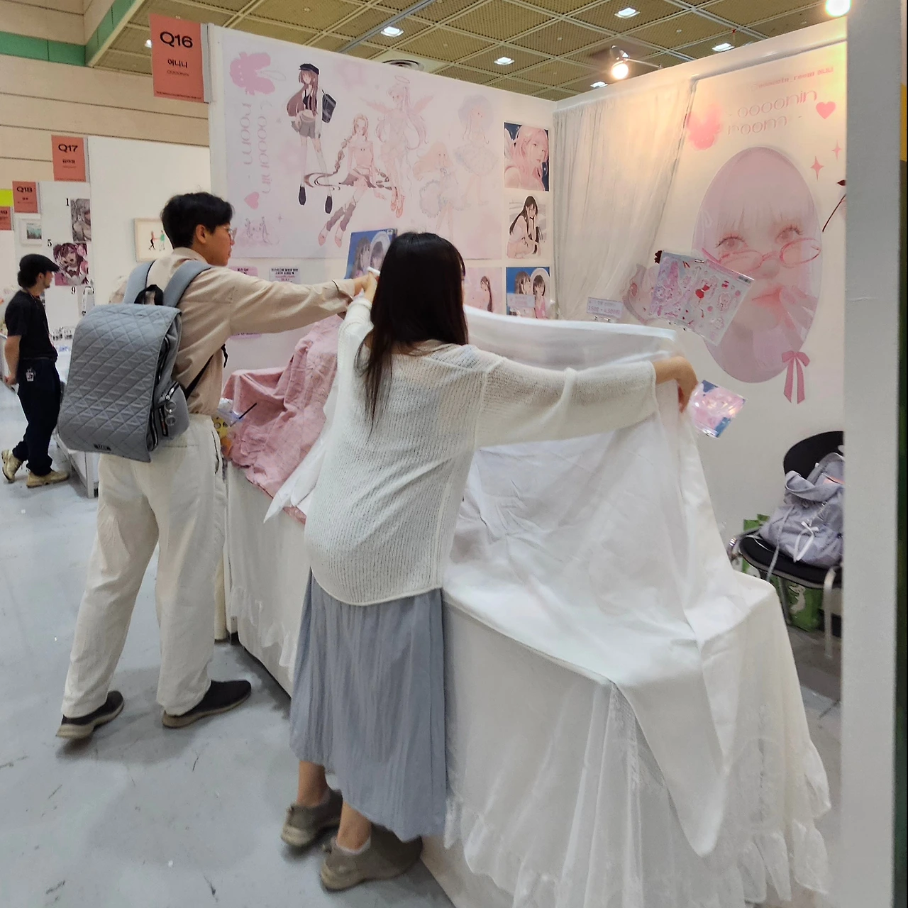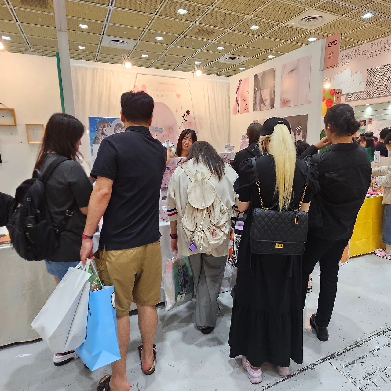 딸의 손 꼭 잡고 도착한 어니니 부스 Q16. 세상 모든 핑크를 끌어다 모아놓은 오밀조밀 예쁜 공간. 딸의 우주다. 든든한 사위가 방문객들을 맞이하고 있고 부스 앞에는 한국인, 외국인, 외계인 가릴 일 없이 와글와글이다. 편한 복장으로 입장한 아빠는 본격적으로 아빠의 R&R (Role & Responsibility) 수행을 위해, 소매를 걷어 붙이려다가 멋쩍게 웃는다. 걷어 붙일 소매 없는 반팔이니 말이다. (지난번 전시회 때 의복을 차려입고 갔더니, 젊은 방문객들이 웬 아저씨? 하며 불편해하던 눈치였기에...)