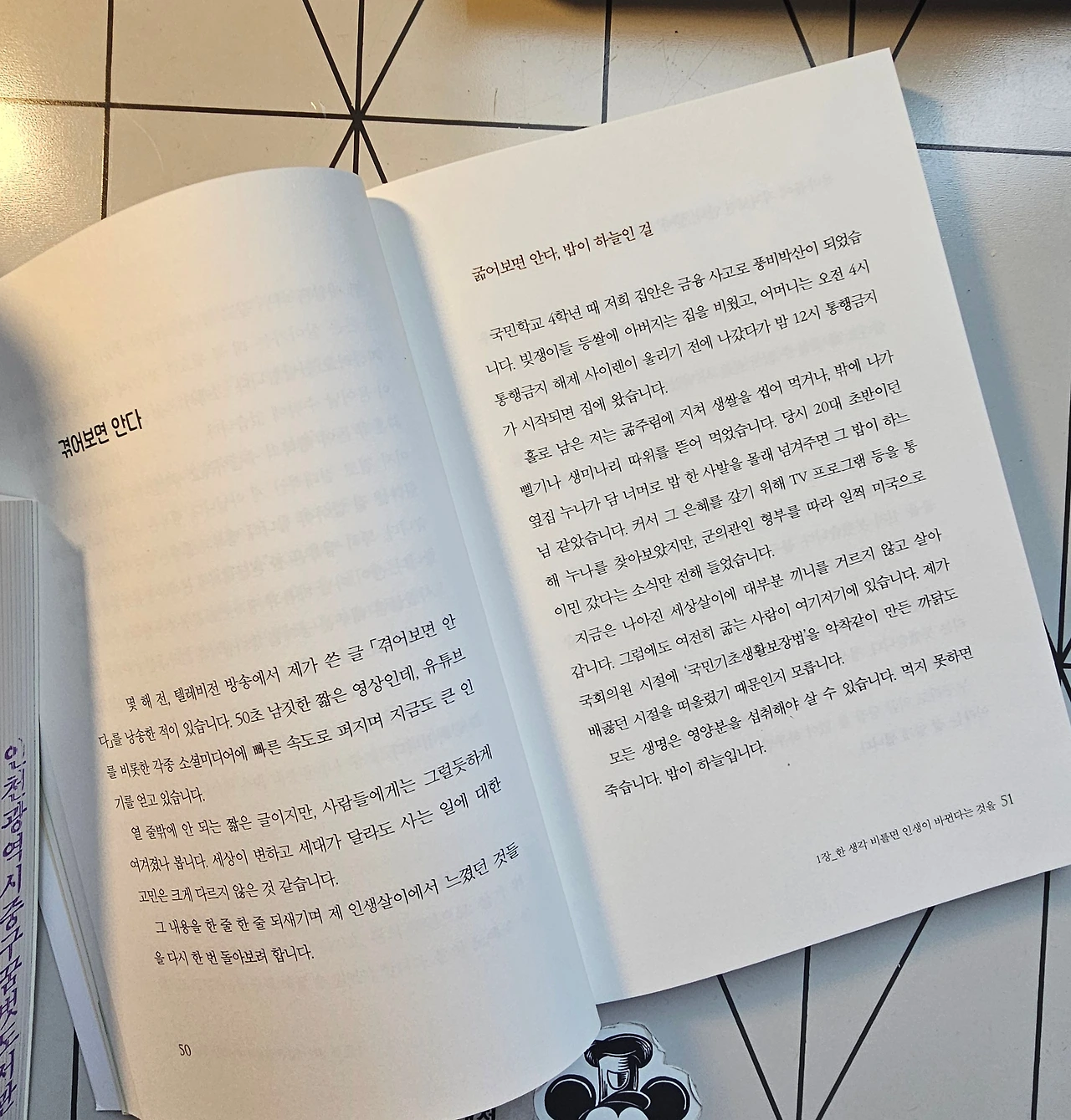 <겪어보면 안다>의 몇 문장을 적어보자. 굶어보면 안다, 밥이 하늘인 걸 목마름에 지쳐보면 안다, 물이 생명인 걸 일이 없이 놀다 보면 안다, 일터가 낙원인 걸 잃은 뒤에 안다, 그것이 참 소중한 걸 ...... 삶의 연륜과 내공 깊은 문장들이 수두룩하다. "살아 있음은 가장 확실한 기적입니다." 책의 마지막 문장이다.