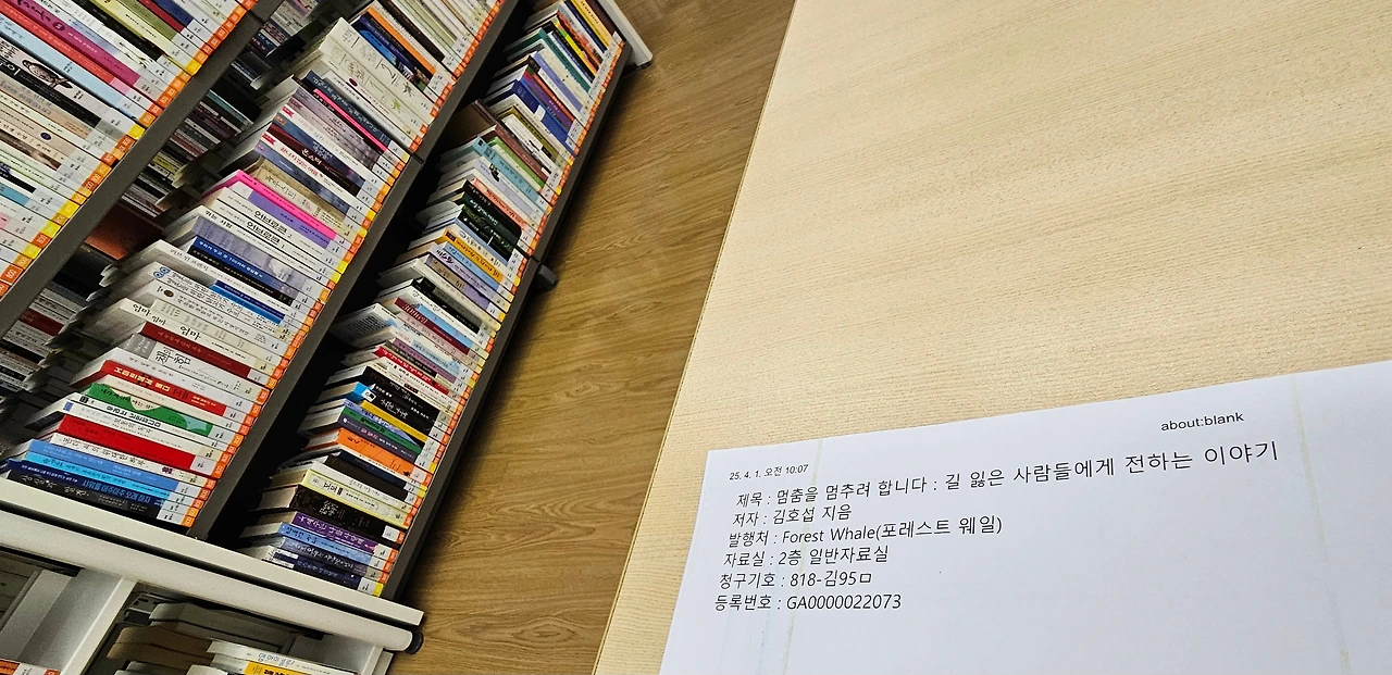 책 제목을 입력하는 순간에 자꾸 오타가 난다. 몇 글자도 안되는데 손가락들이 살짝 떨리는 걸 보니 아마도 긴장선을 타고 있나 보다. 슬로비디오가 걸리고 시간은 꿈결처럼 흐른다. 조회하려는 책은 <멈춤을 멈추려 합니다>. 그리고 엔터.