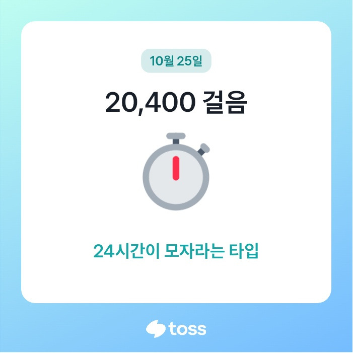 그리하여 2만보를 넘는 날이 며칠 반복되다 보니, 걷기 App (토스)에서 통보를 해온다. 이런 식이다.