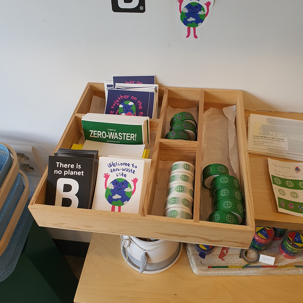 일단 들어가면 가판대가 있는데 그 옆에도 여러 가지 물품을 판매한다. 그 옆쪽에 바로 거대한 진열대가 존재한다. 그곳에서 여러 물품을 발견할 수 있다. 그리고 안쪽 내부에는 테이블이 자리잡고 있다. 곳곳에 제로 웨이스트 물품들이 있기 때문에 구경하다 보면 어느덧 한 시간이 흘러 있을 것이다.