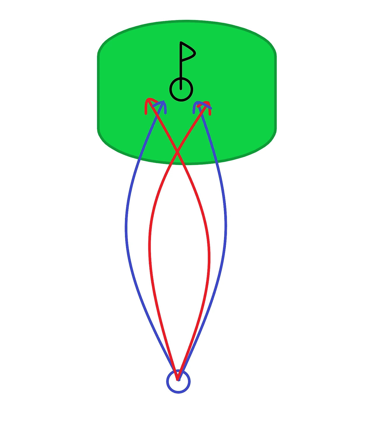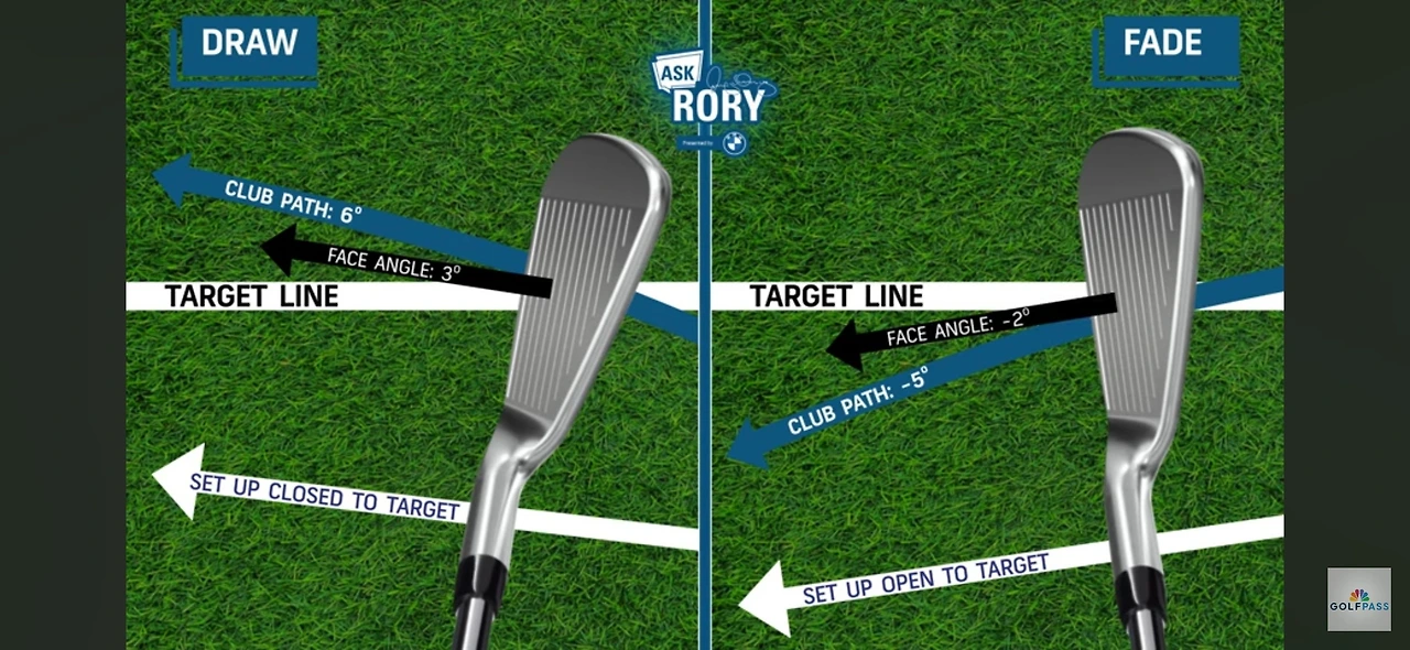 차이가 보이는가? 빨간색 궤적이 예전의 드로우 페이드샷, 파란색 궤적이 몇 년 전에 내가 봤고 지금 로리 맥길로이가 설명하는 드로우 페이드샷이다.