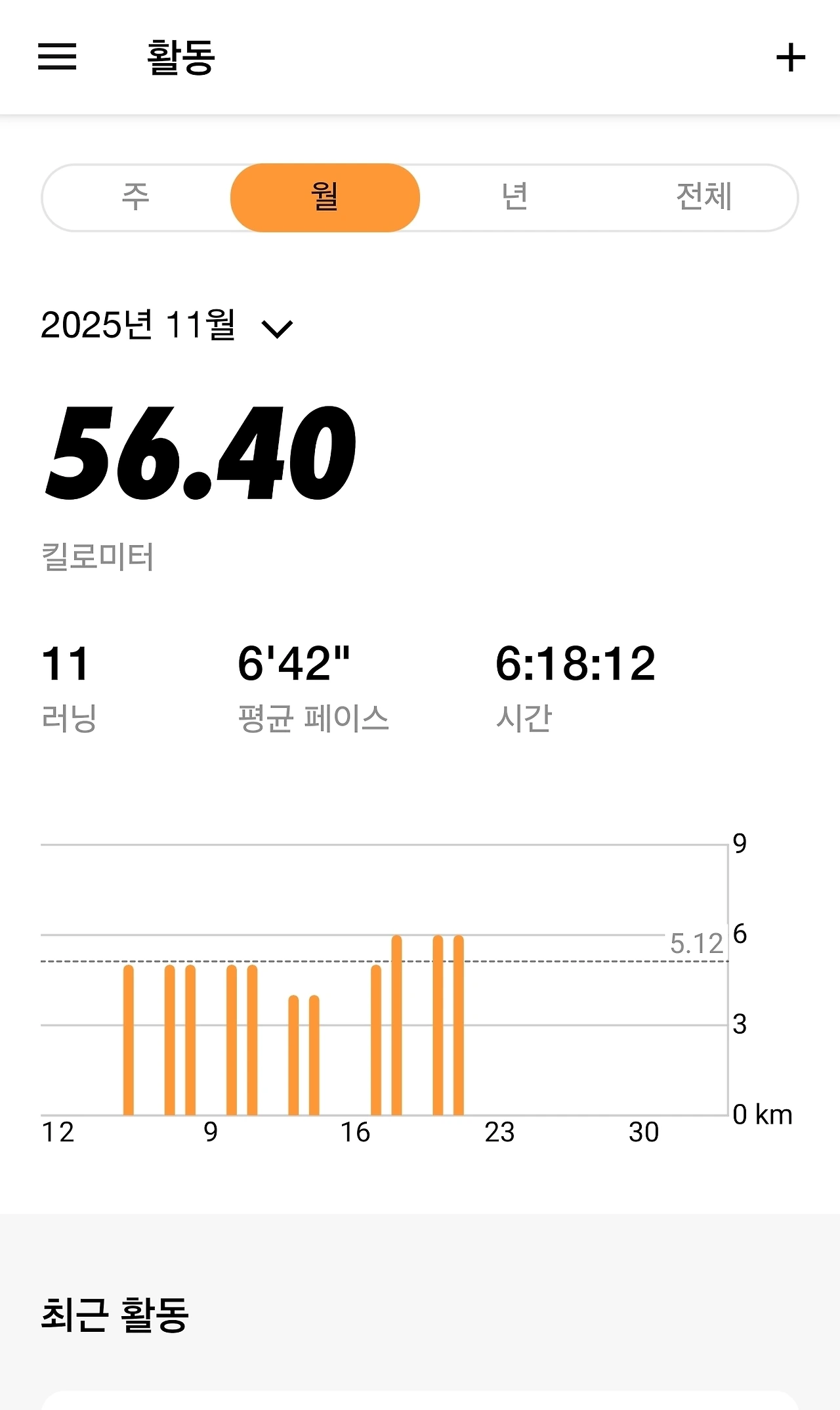 런데이 어플에 있는 11.38km를 합치면 11월 22일 토요일까지의 월 마일리지는 67.78km가 된다. 오늘은 쉬는 날이다. 이틀 뛰고 하루 쉬는 패턴을 반복하고 있는데, 처음에는 30분 달리기로 설정하고 달려서 4~5km 남짓을 달리다가 나흘 전부터 40분으로 시간을 늘리면서 6km까지 달리게 되었다. 계획대로라면 11월 30일까지 6번을 더 달릴 수 있으니 최대 36km를 더하면 11월 목표 마일리지는 100km가 된다. 내년 3월까지 10km를 60분으로 달리는 것이 목표다. 현재 6분 30초 페이스로 달리고 있으니 거리를 채우기에도 속도를 늘리기에도 아직은 갈 길이 멀다.