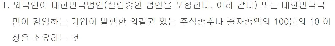 "『외국인 투자 촉진법』제2조"를 보면 '외국인 투자기업이 되려면 주식 총수나 출자총액의 100분의 10 이상을 소유해야 한다'라고 적혀있다.