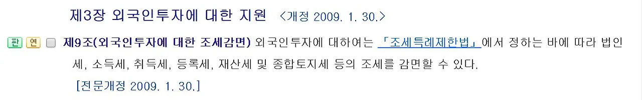 대한민국은 외환위기 직후인 1998년 외국인 투자를 통해 국내 경제에 활력을 불어넣기 위해 외국인 투자촉진법을 제정했다. "『외국인 투자 촉진법』제3장의 제9조"를 보면 '외국인 투자에 대하여는 조세특례 제한법에 따라 조세를 감면할 수 있다'고 나와있다.